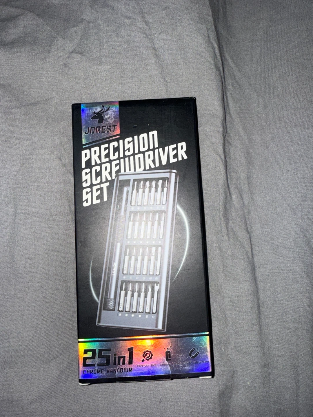 This is a 25-in-1 JORGEST precision screwdriver set. It's made of chrome vanadium. This set includes multiple bits for various repair tasks.