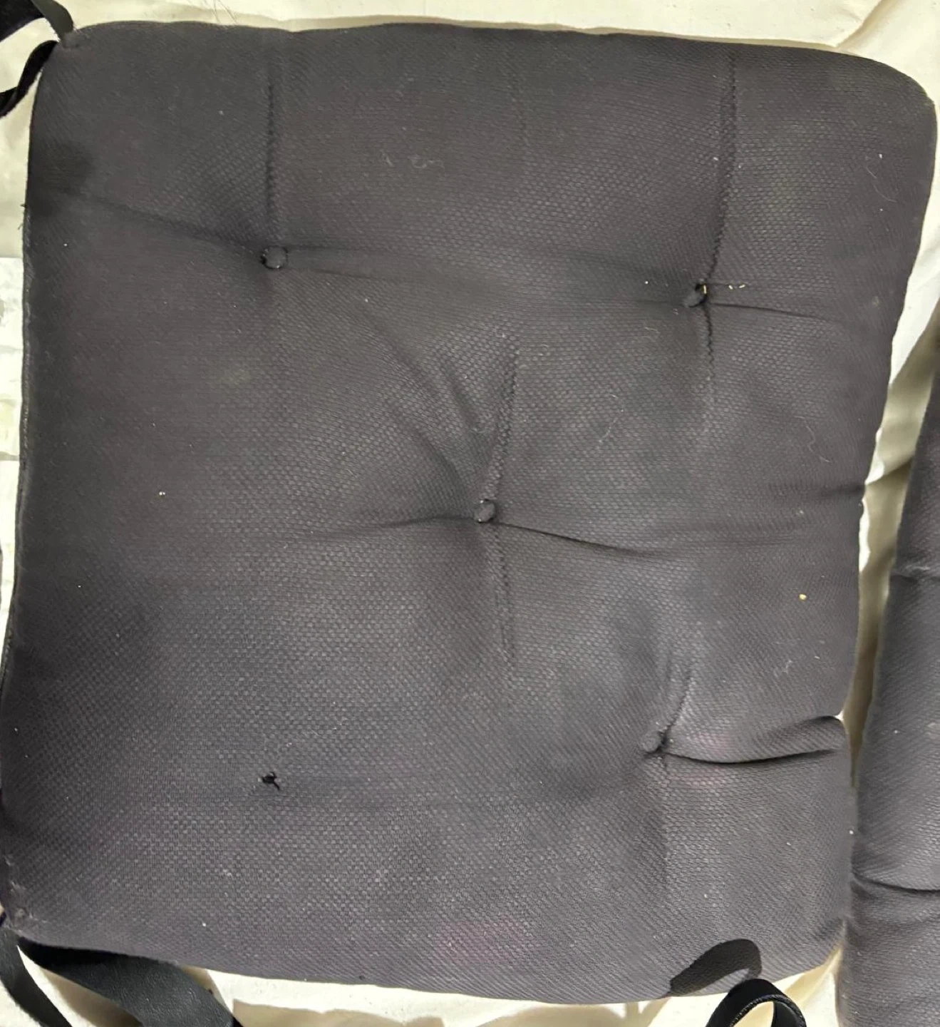 Set of four black seat cushions with ties. Fabric appears durable and suitable for outdoor use. These cushions will add comfort to your patio chairs. Pick up from Maple Vaughan. Major intersection keele and Rutherford. Near Rutherford go station