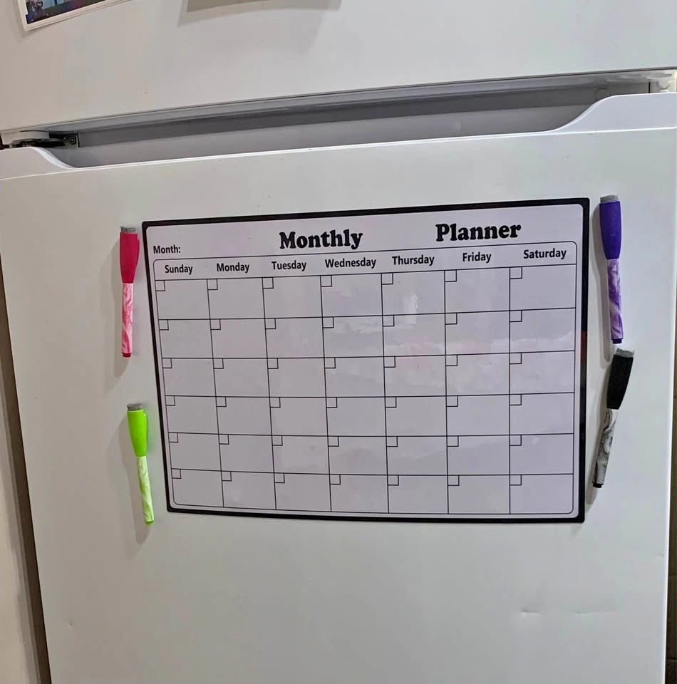 Back is a bit sticky because I put duct tape on it so it would stick to a wall, but still sticks onto a fridge perfect without leaving residue. I got the markers from the dollar store, the orange one’s magnet has fallen off and the green one’s loose. Overall found this product very useful for staying organized and looked very nice on my fridge especially with multiple colors on it.