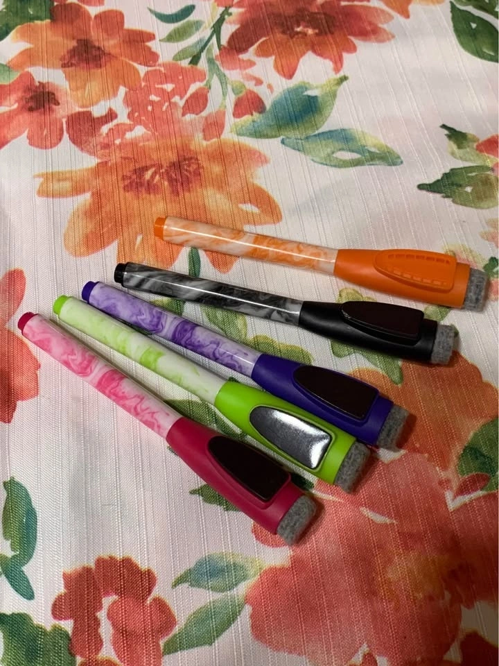 - 5 magnetic draw and erase markers ( orange, black,purple, pink, green)