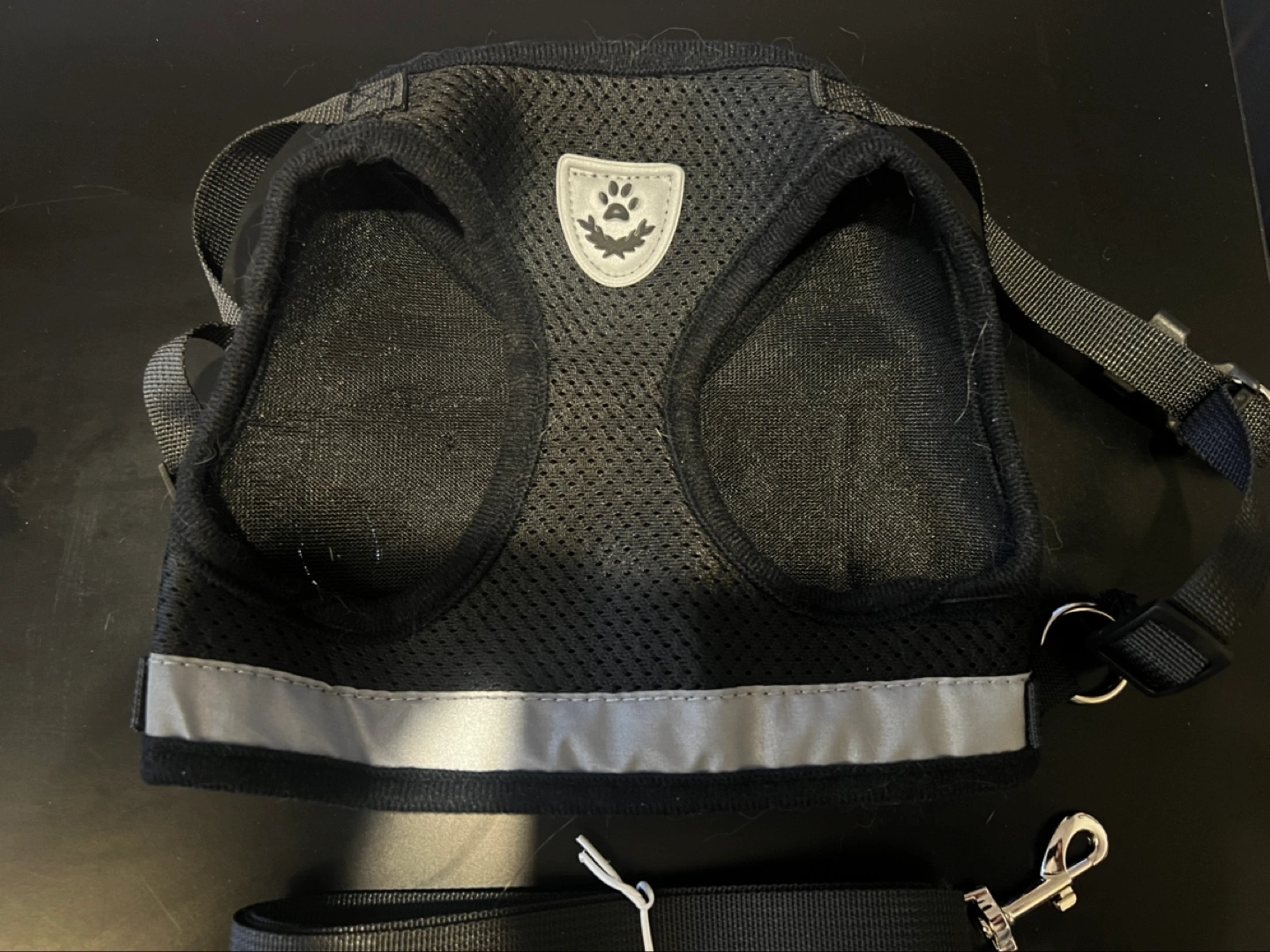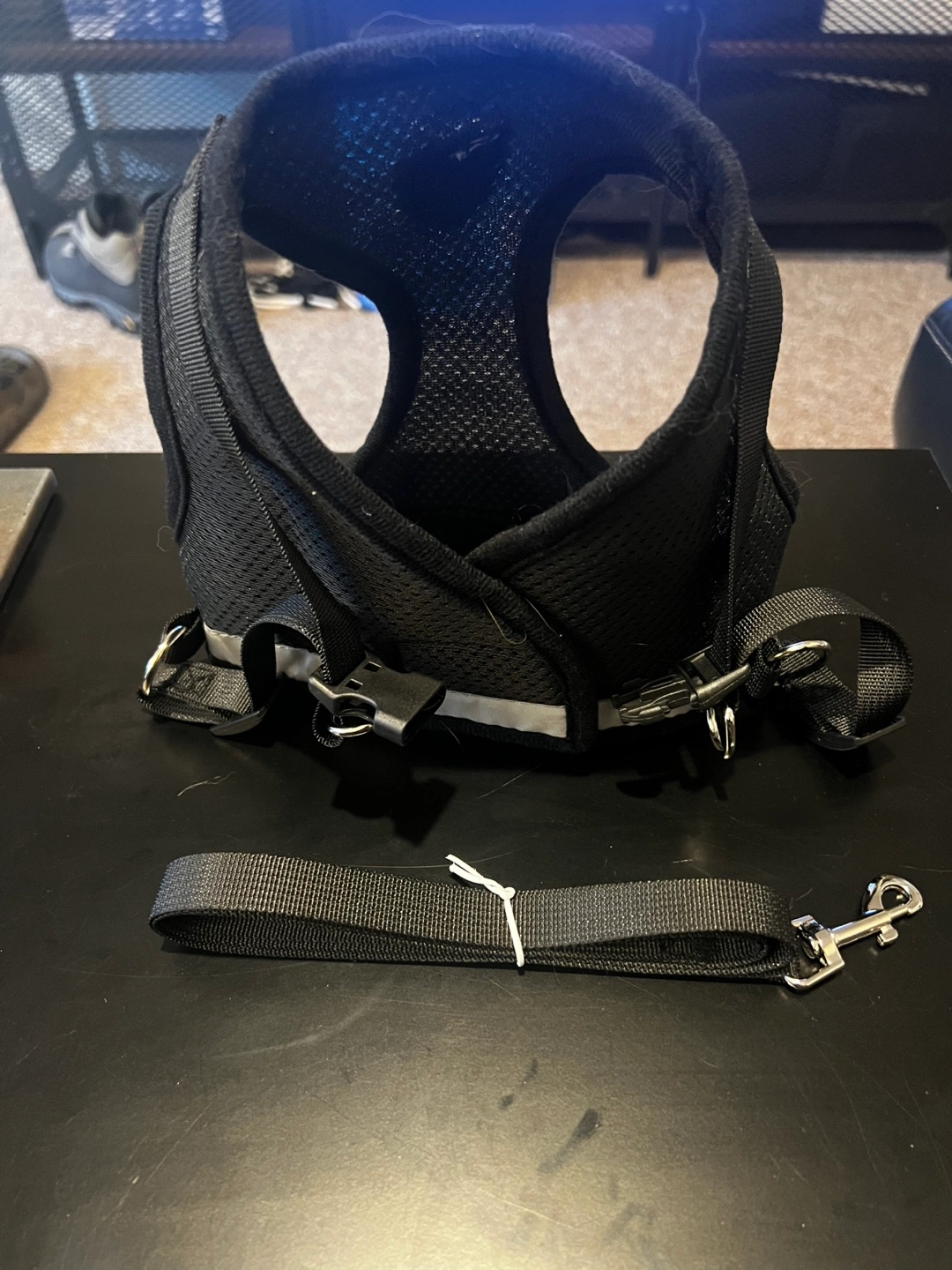 Brand new Cat/Small Dog black harness and leash. Size large. Features reflective strip for nighttime visibility. Mesh fabric for breathability. Includes matching leash.