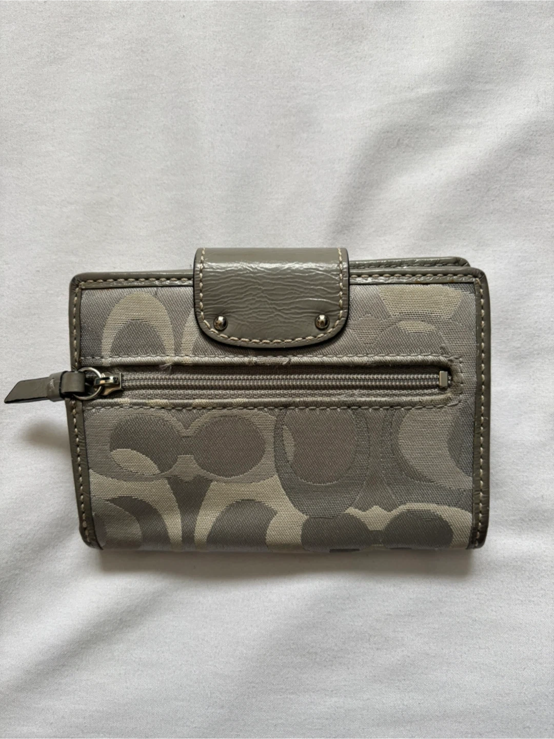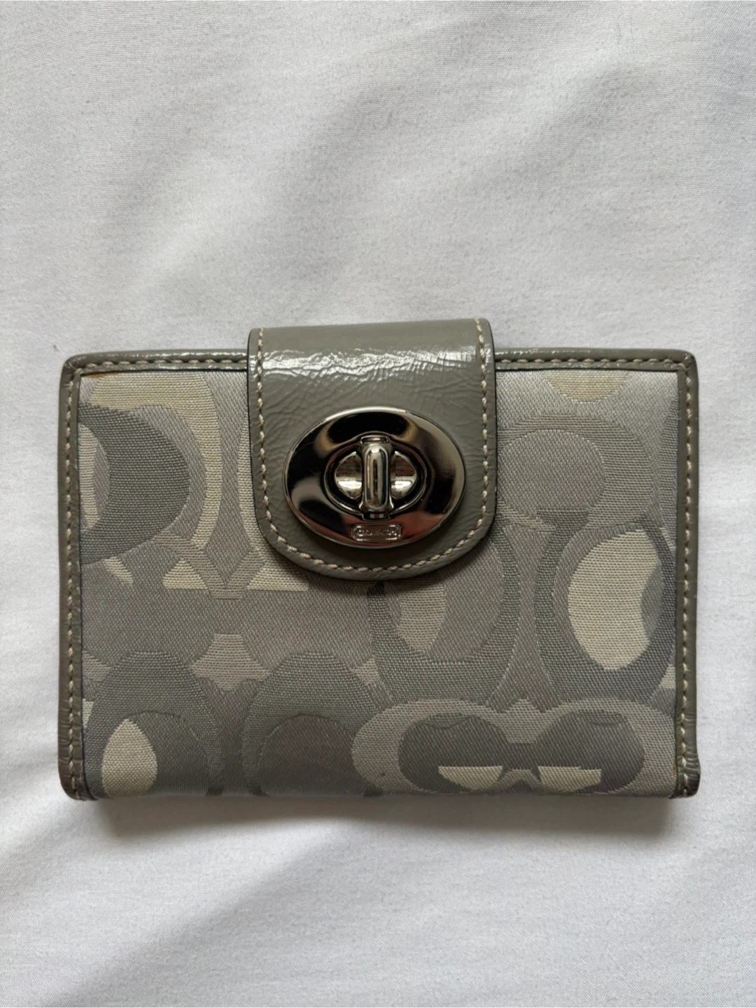 This is a pre-owned Coach bifold wallet featuring the signature C pattern. It's grey with a grey patent leather snap closure and a zippered coin pocket on the back. Plenty of card slots and a clear ID window inside.