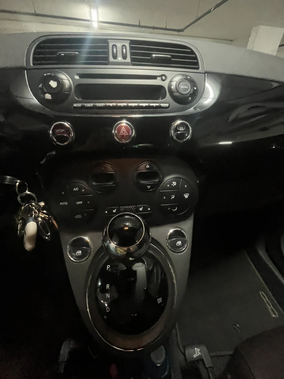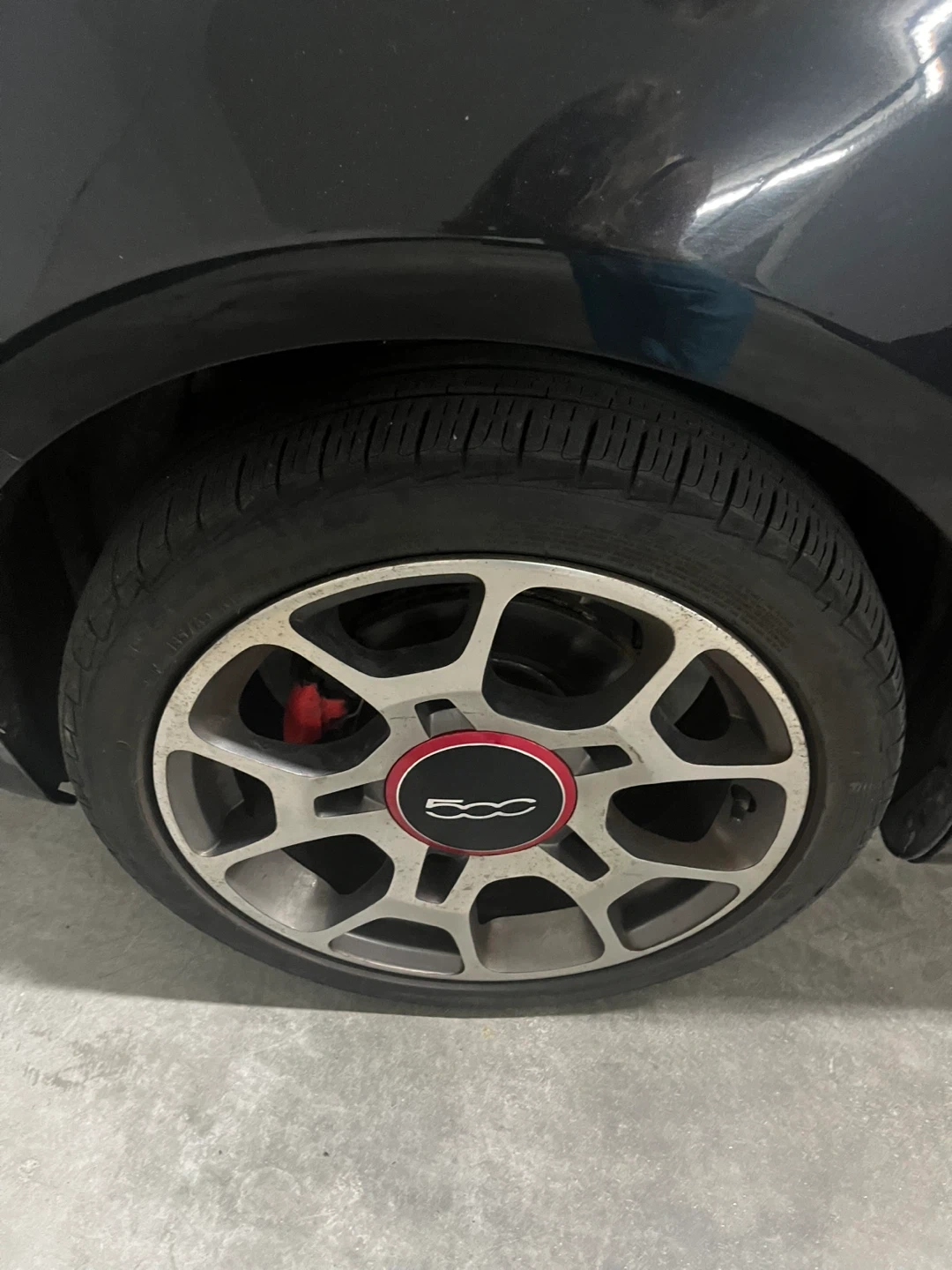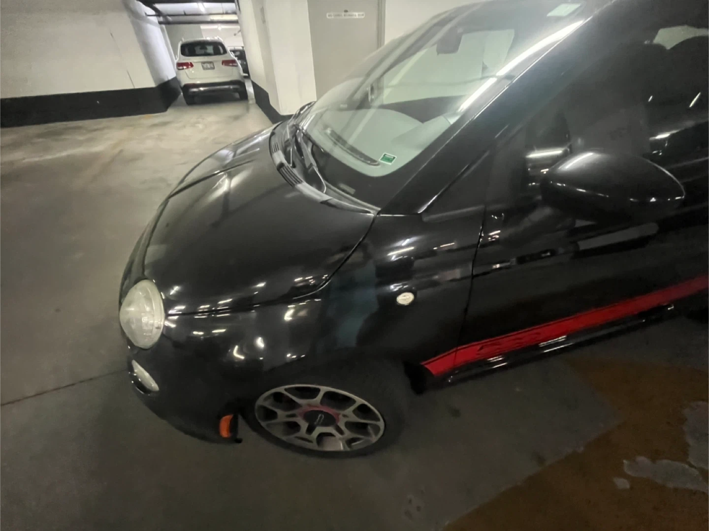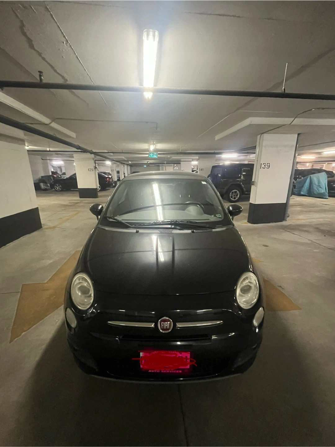 Selling a black Fiat 500. It has a red stripe on the side and a sunroof. The tires are in good condition.