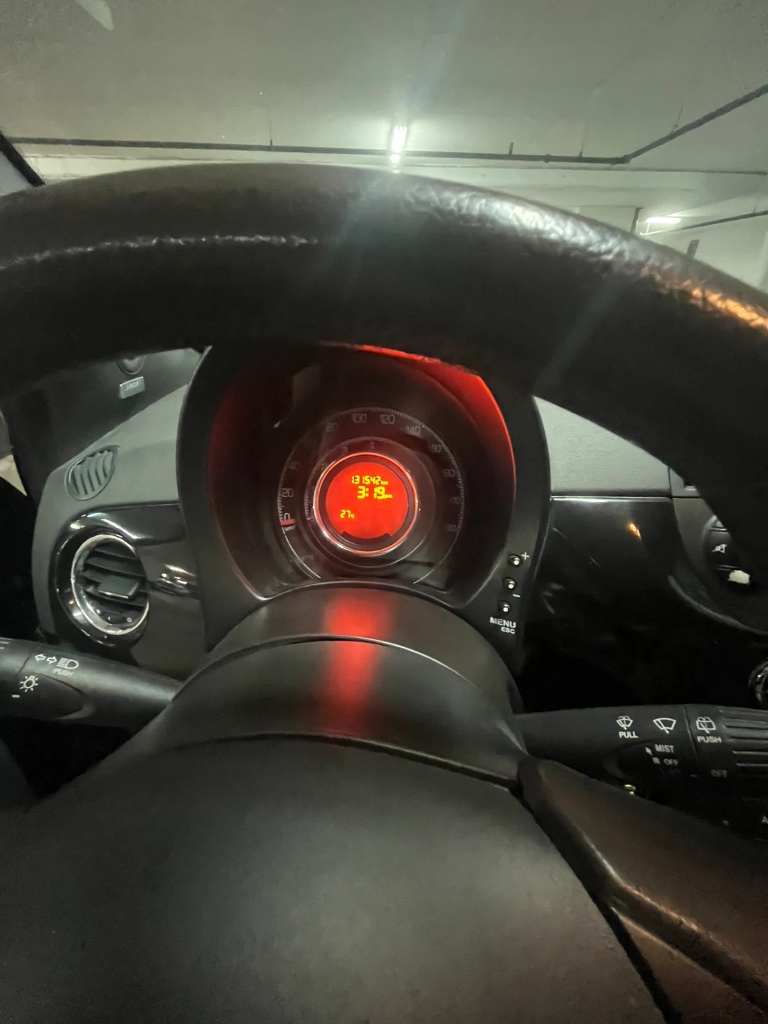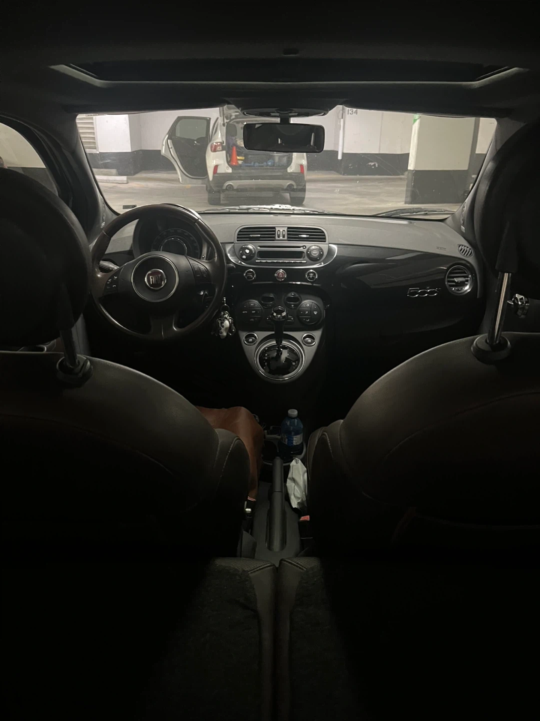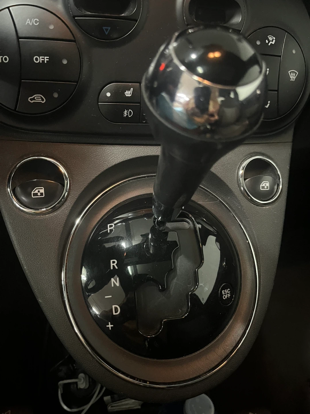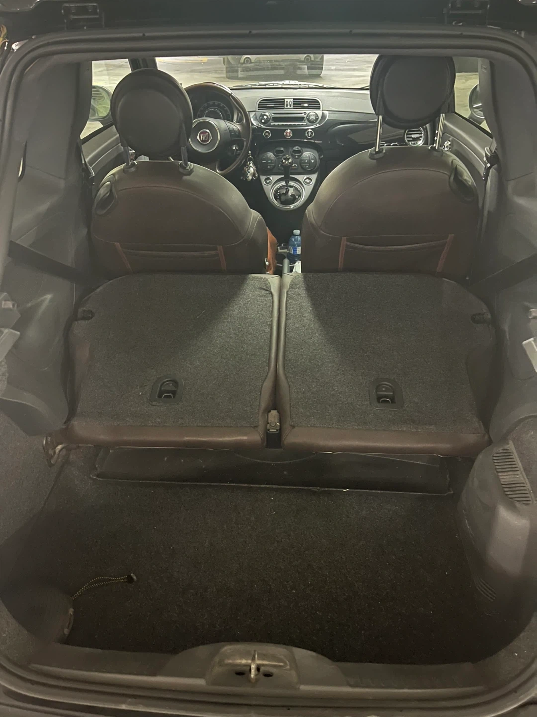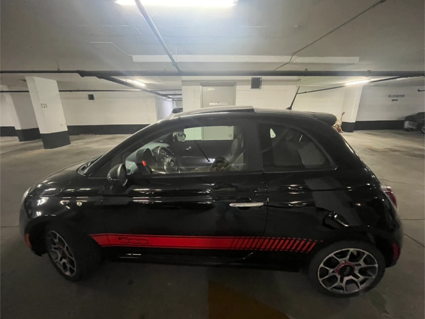 Selling a black Fiat 500. It has a red stripe on the side and a sunroof. The tires are in good condition.