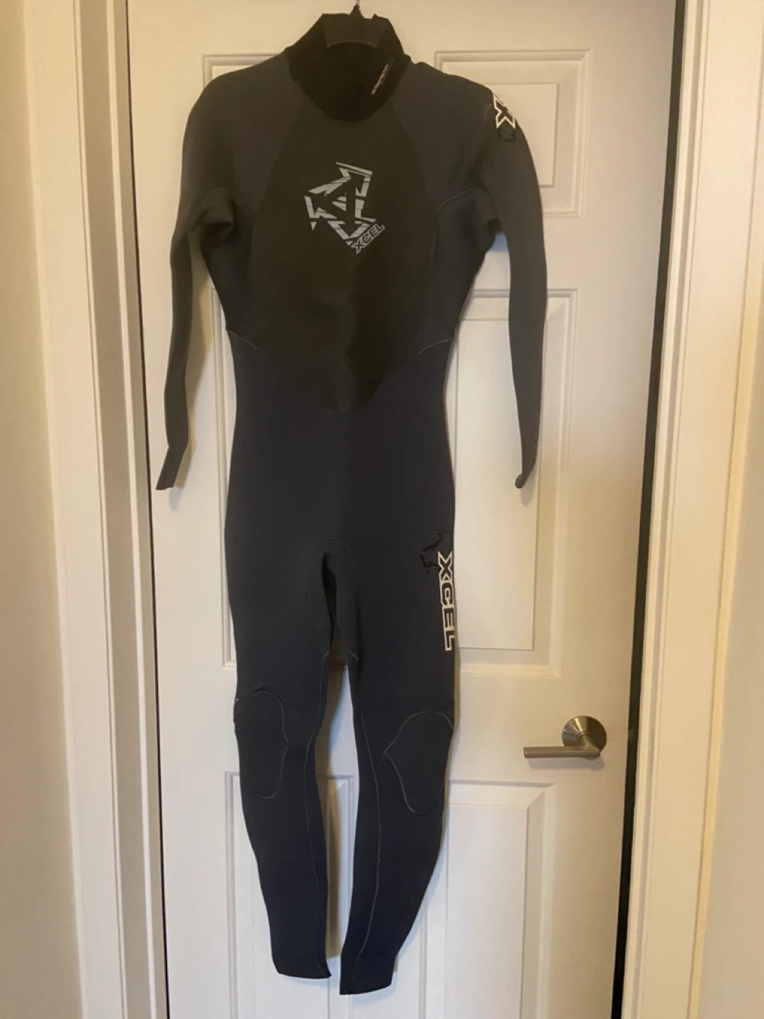 XCEL wetsuit with ultrastretch and bamboo lining. Back zip entry. Full length sleeves and legs. Size medium. Never worn