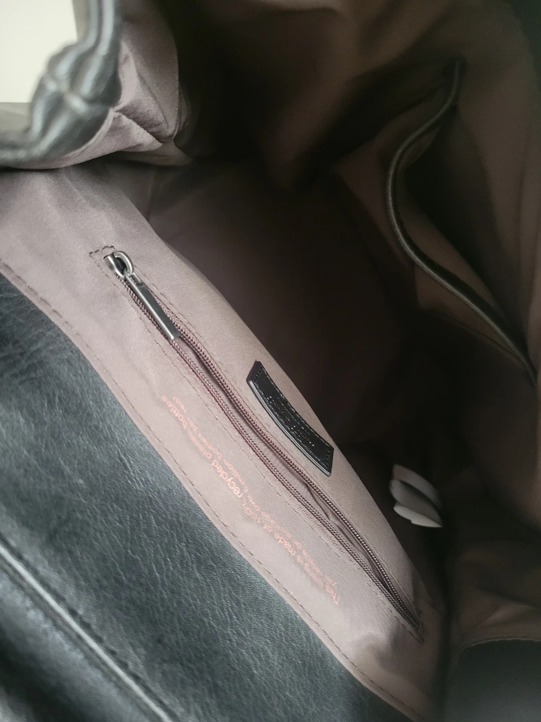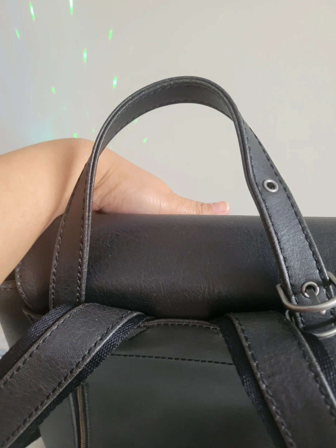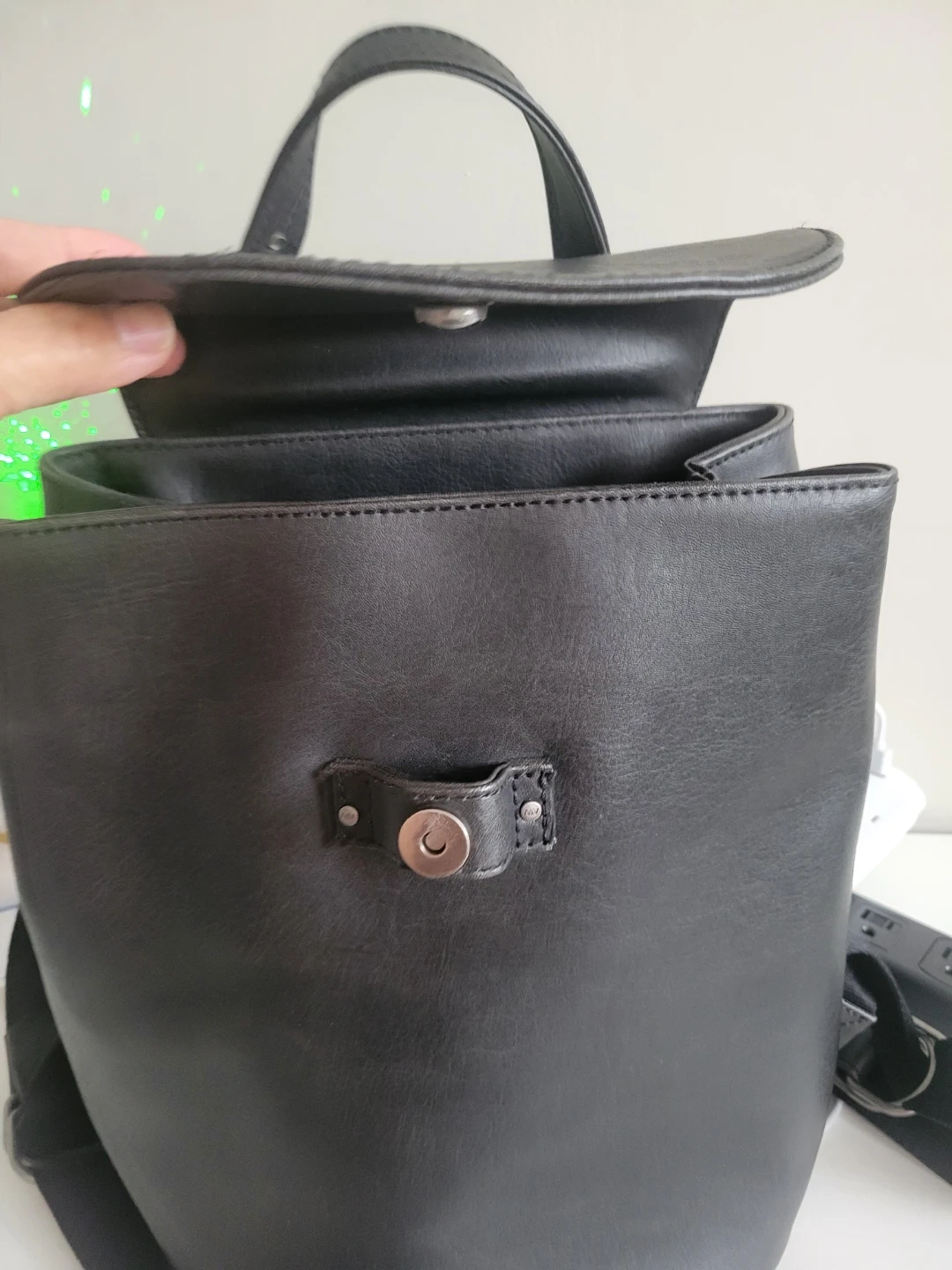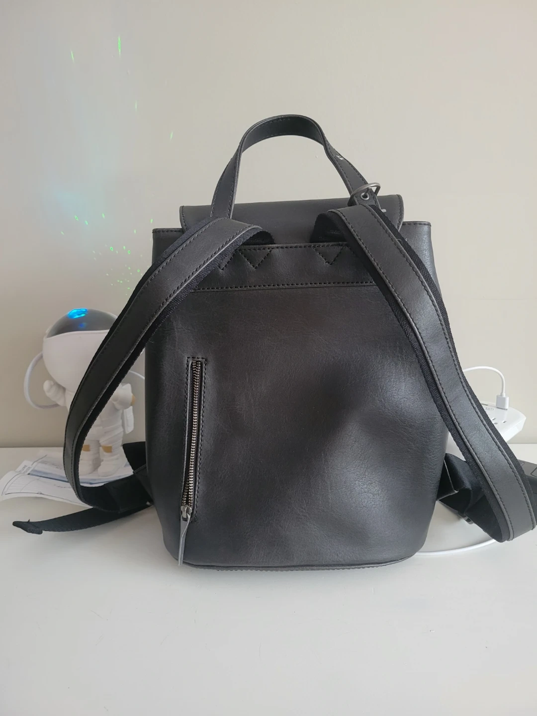 This black backpack is made from vegan leather. It features adjustable straps. The interior has a zippered pocket and a main compartment.