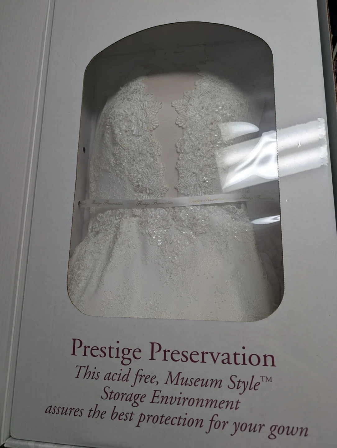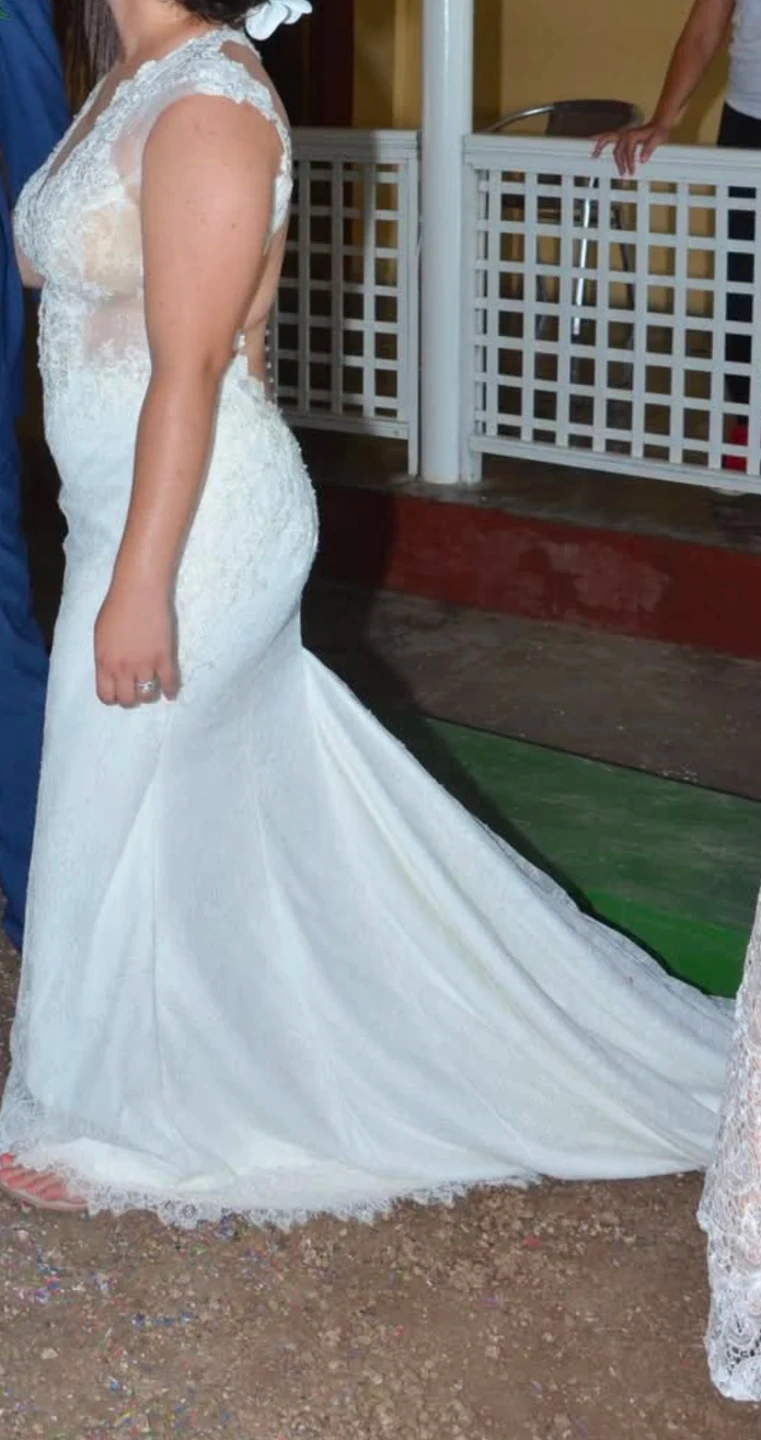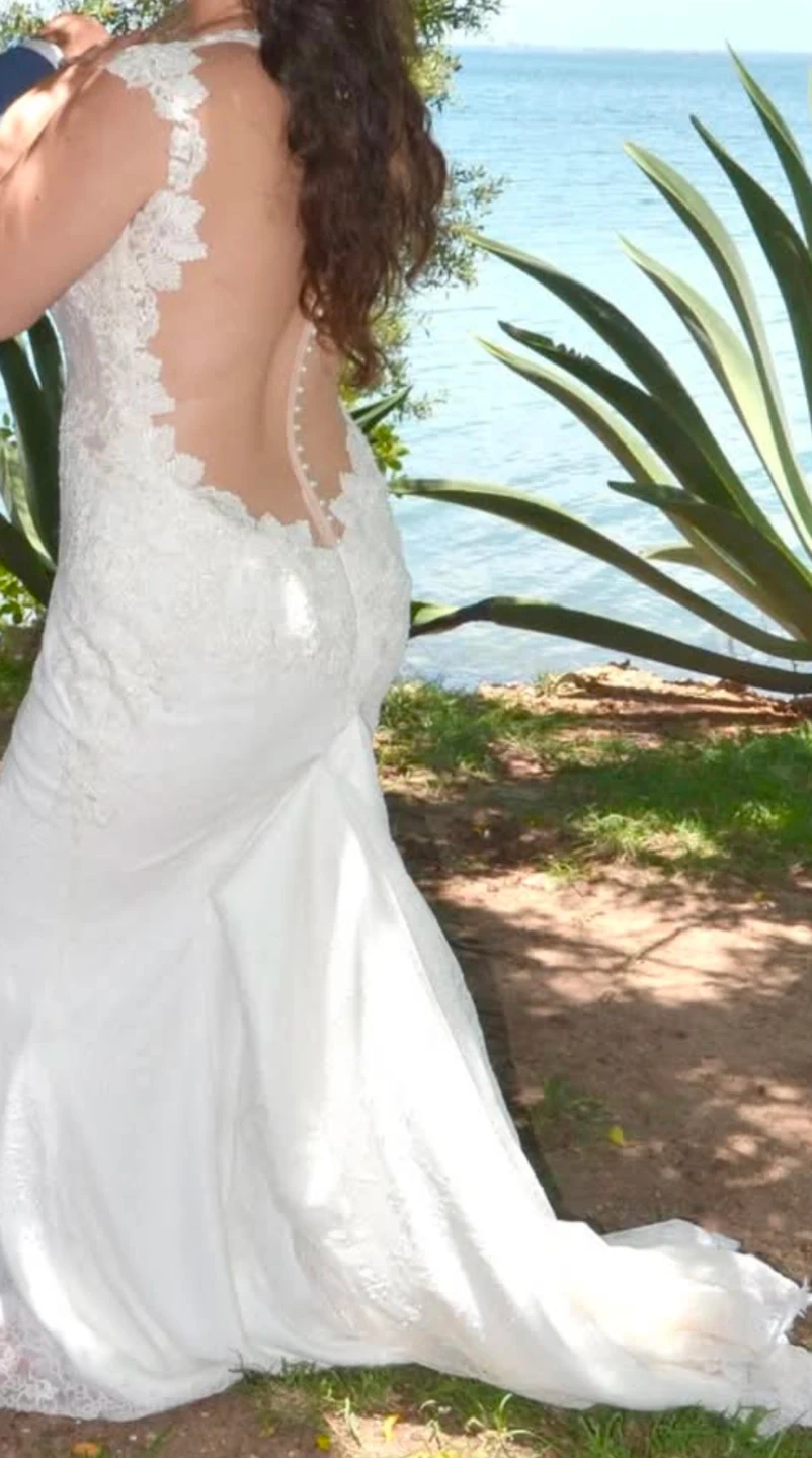 Beautiful white dress with intricate lace and beadwork. Features a stunning illusion back with a pearl closure. The dress has a fitted silhouette with a dramatic train. Stored in original preservation box. The designer is Ines Di Santo, 2019.