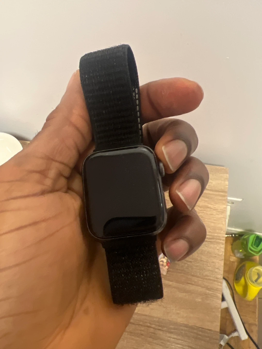 This is an Apple Watch Series 5 with a black Sport Loop band. It's a sleek and durable accessory for your wrist. This watch is suitable for daily wear and fitness tracking.