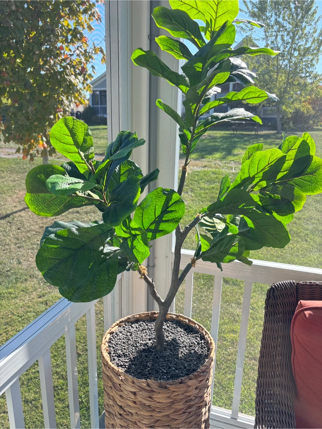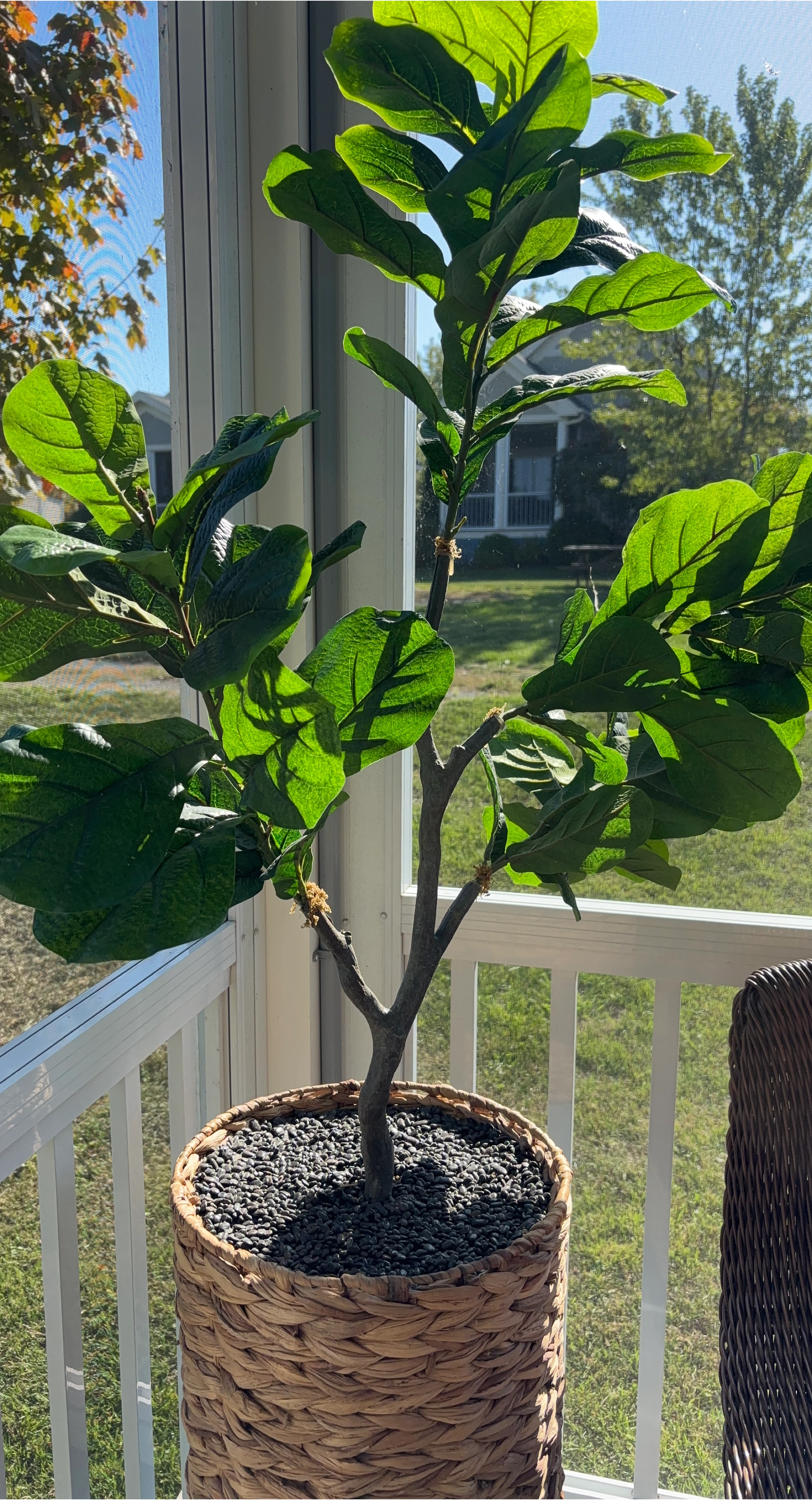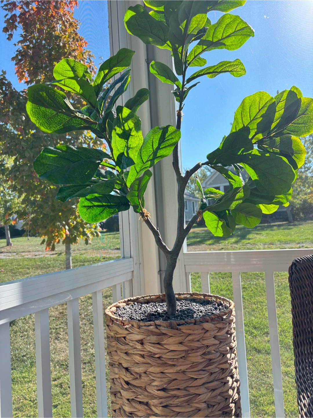 Selling a lovely artificial fiddle leaf fig tree! It comes in a beautiful woven basket with dark pebbles on top. It's perfect for adding a touch of year round greenery to your home