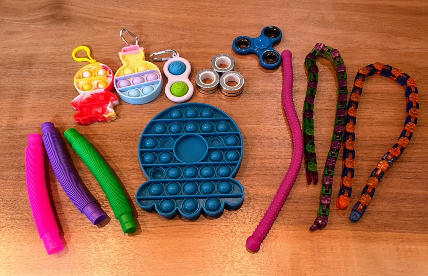 Selling a fun bundle of fidget toys! Includes a variety of pop its in different shapes and colours, a blue fidget spinner, and some other cool sensory toys. Great for stress relief or just keeping your hands busy!