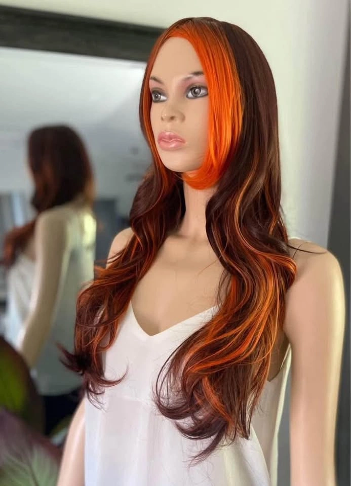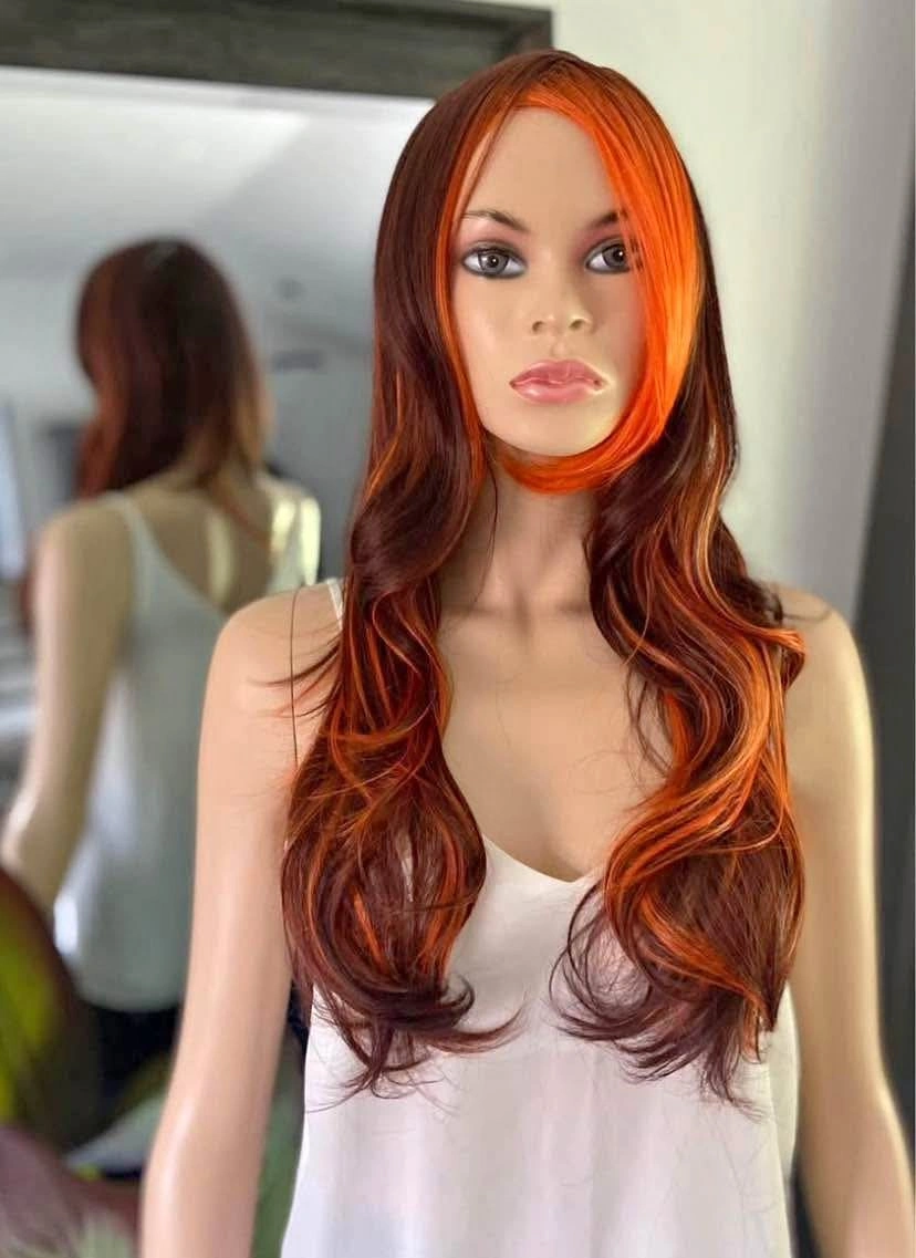 83Brand new, from a smk-free home Long, layered, wavy, dark brown wig with straight parting and fiery bright orange long side-swept bangs and highlights Stretch lace cap is breathable and comfortable Inner elasticated adjustable straps One size fits most Pick up north end St Catharines