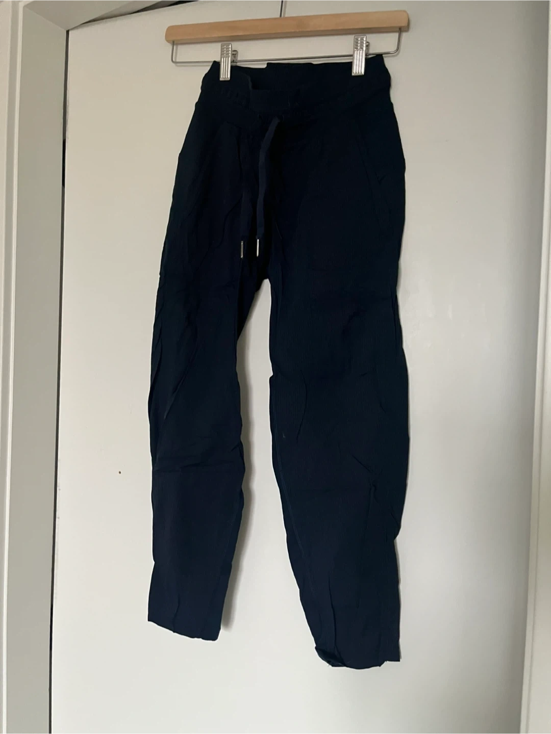 Navy blue Lululemon dance studio pants. These pants are made from a comfortable fabric and feature a drawstring waist. They're great for workouts or casual wear!