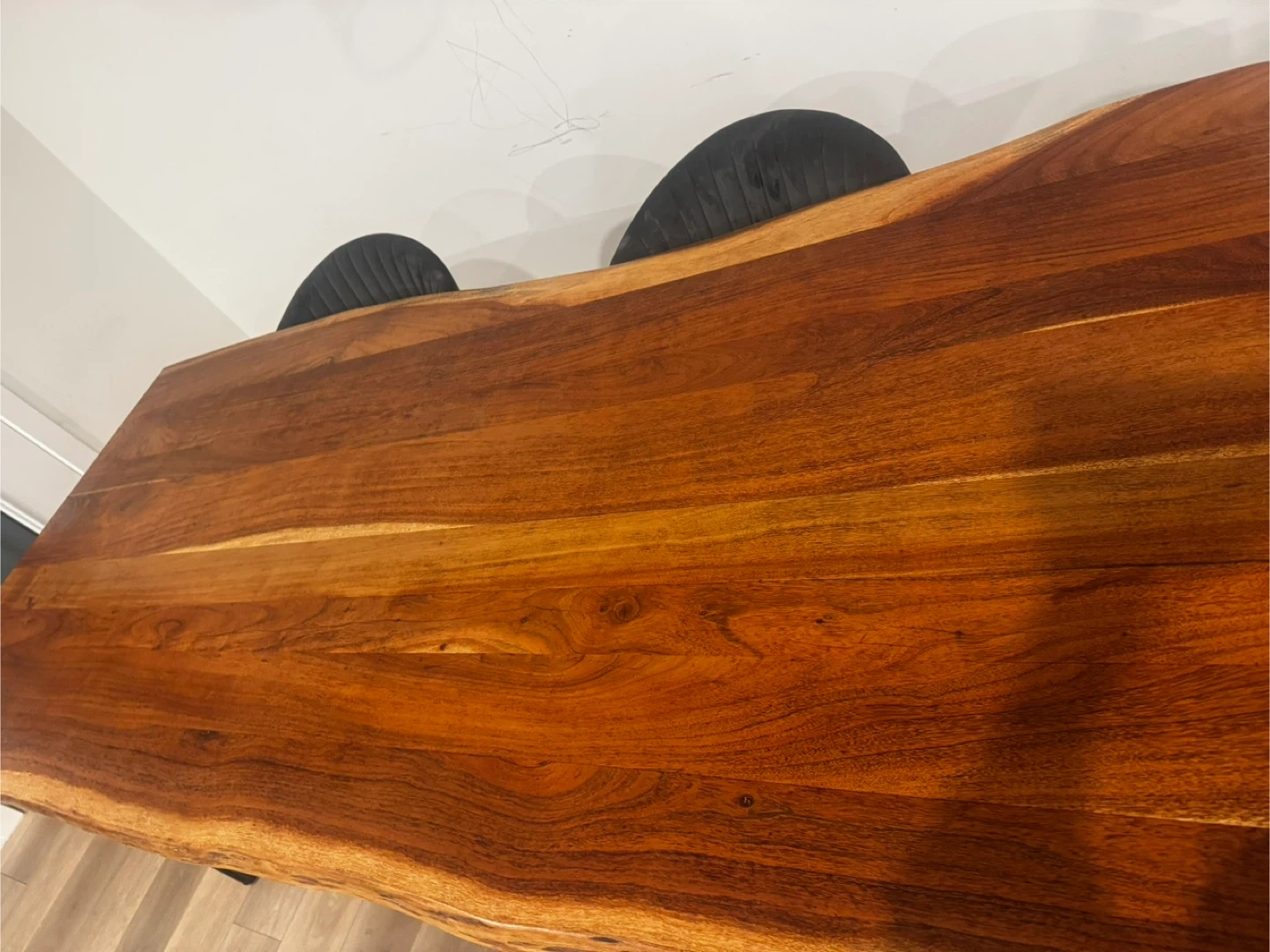 Selling a beautiful wood dining table paired with 6 grey velvet chairs. Very minor stains on the chairs (that can be cleaned). Overall in good condition. The table is 210 cm long.