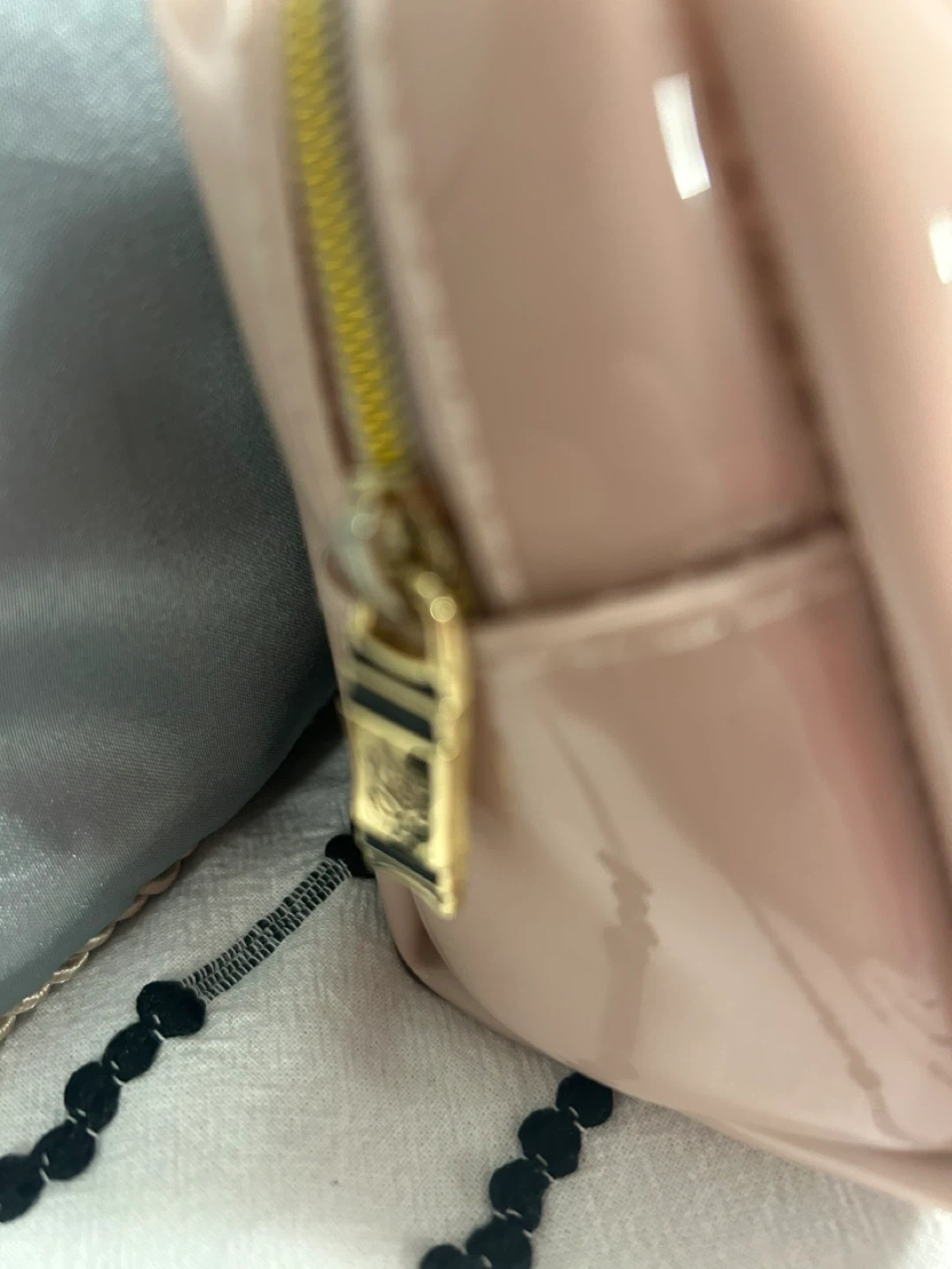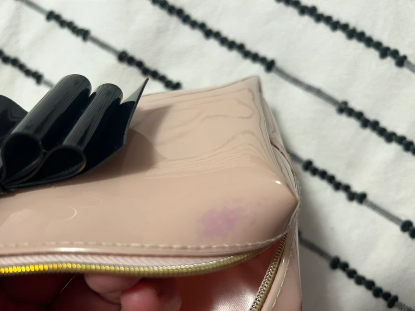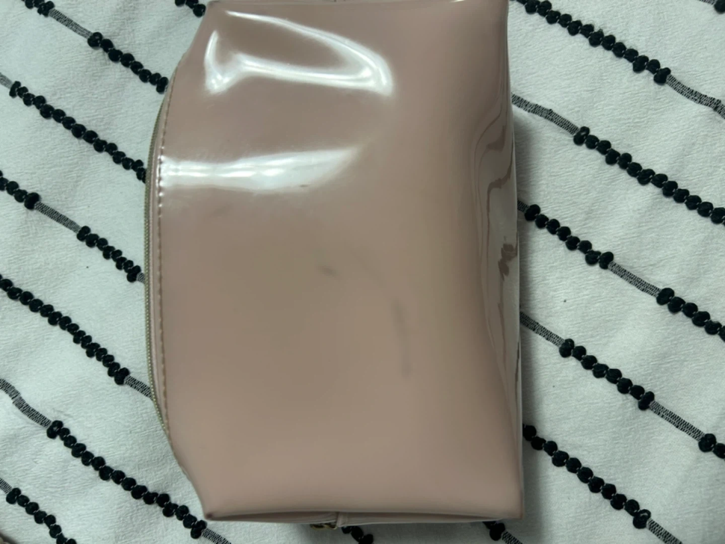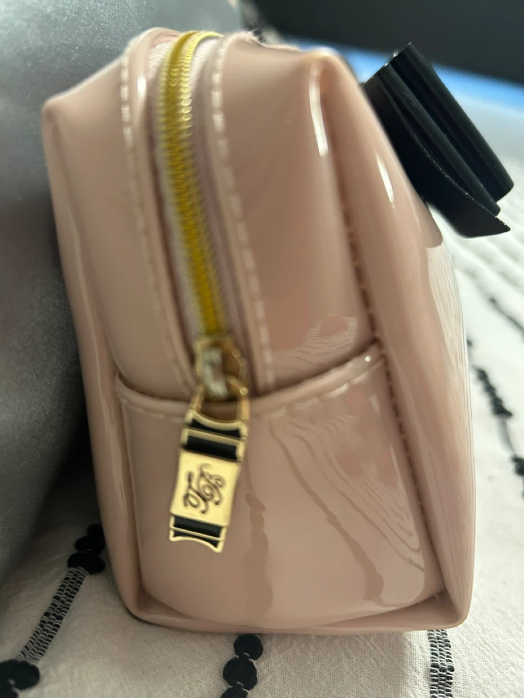 This Ted Baker cosmetic bag is made of shiny pink patent material and features a black bow accent. It has a zippered closure and a gold-tone zipper pull. It's a great size for carrying makeup or toiletries. 17 cm X 12 cm