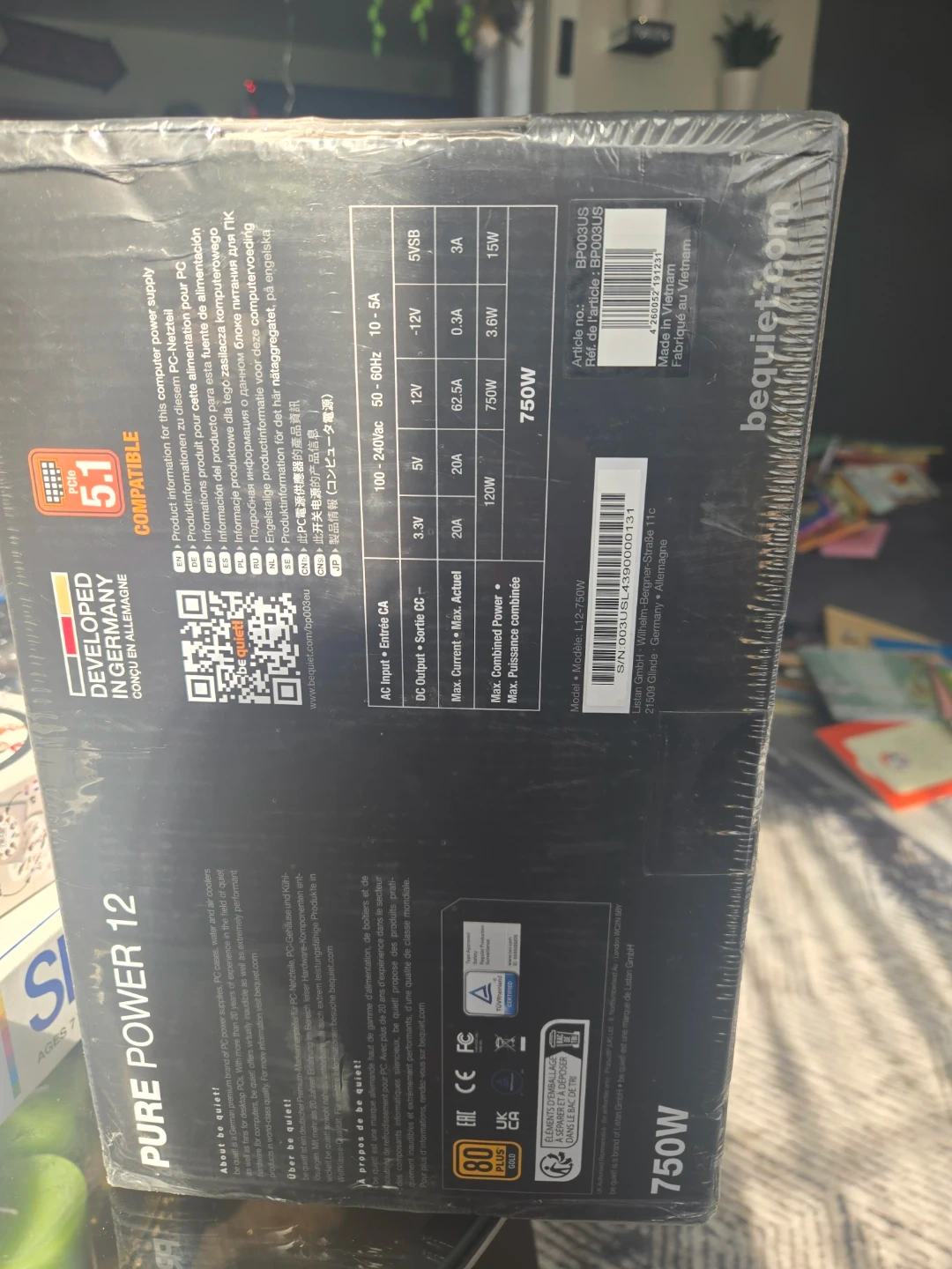 This is a be quiet! PURE POWER 12 750W power supply. It's 80 PLUS GOLD certified. It has a modular design for easier cable management. Sealed