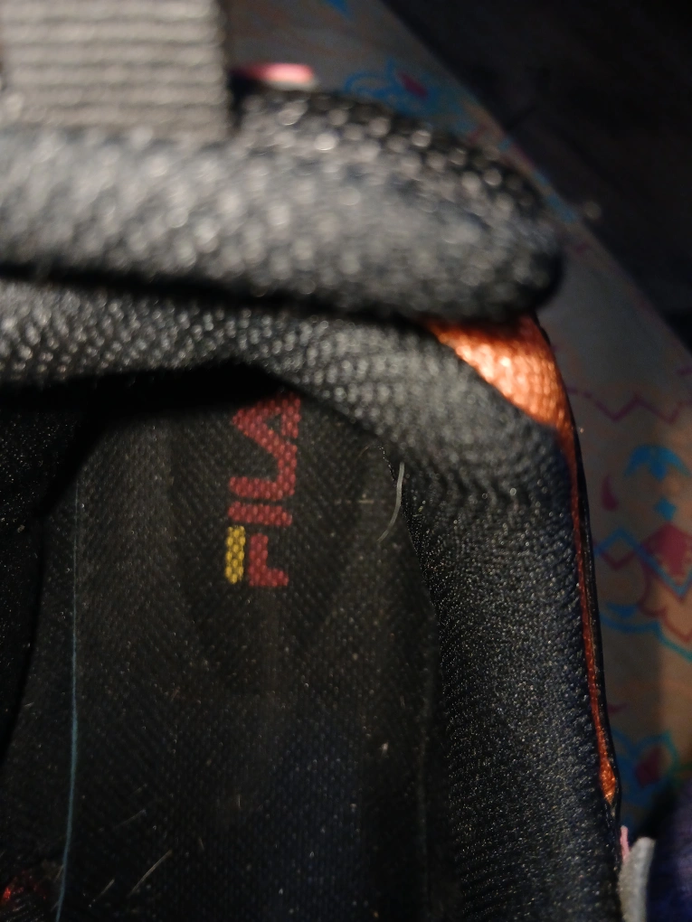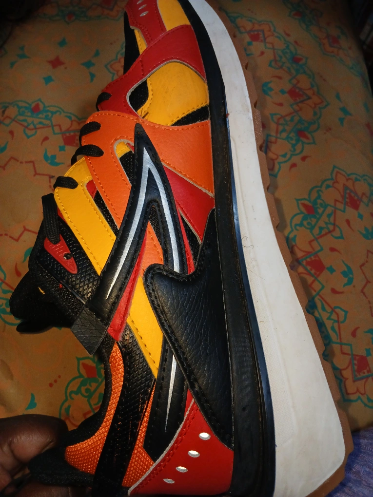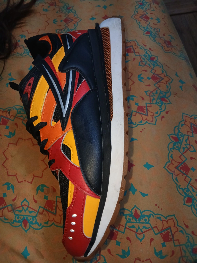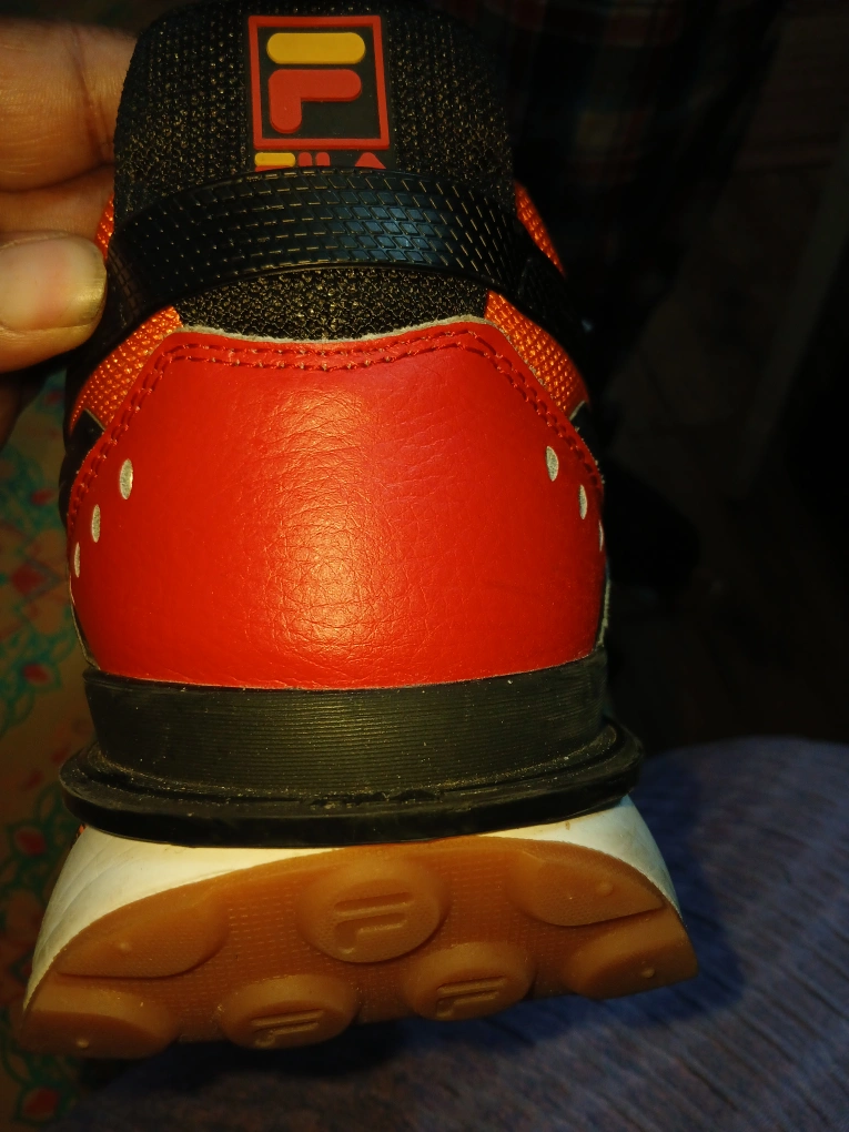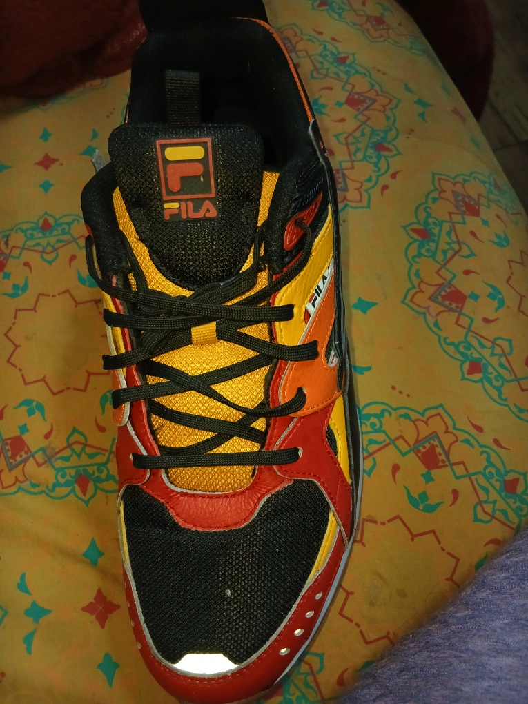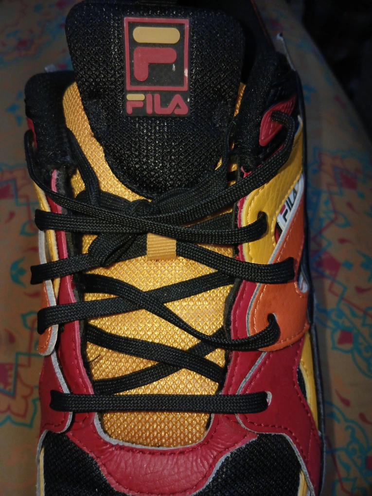 Selling a pair of Fila athletic shoes. They feature a mix of red, orange, yellow, and black colours. Great for casual wear or light workouts!