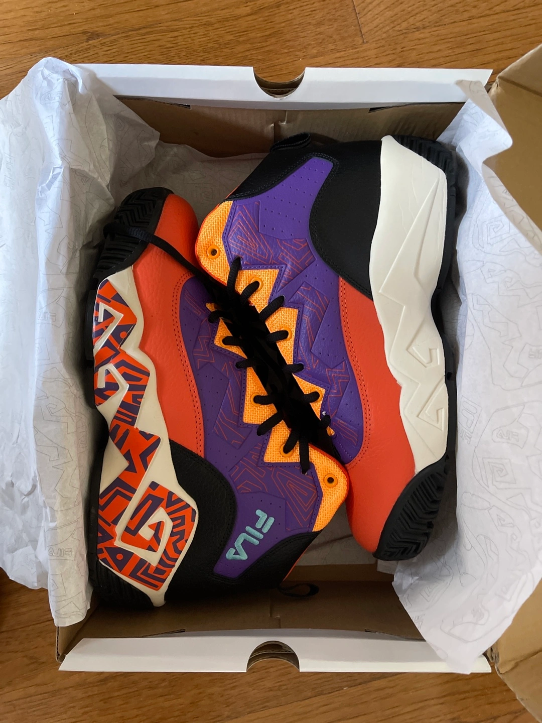 Selling a pair of Fila basketball shoes. They come in a vibrant mix of orange, purple, black, and white. The shoes are in their original box