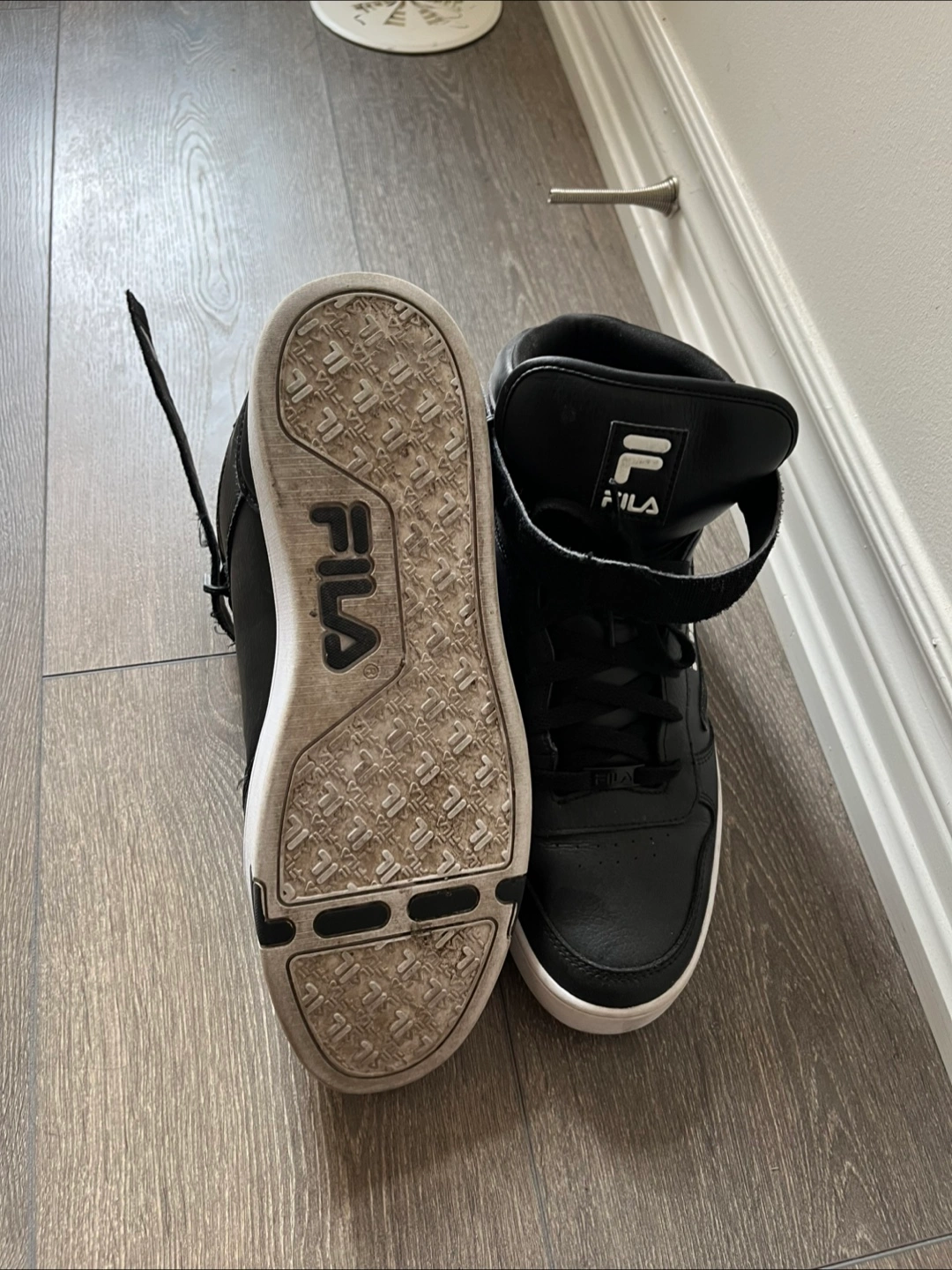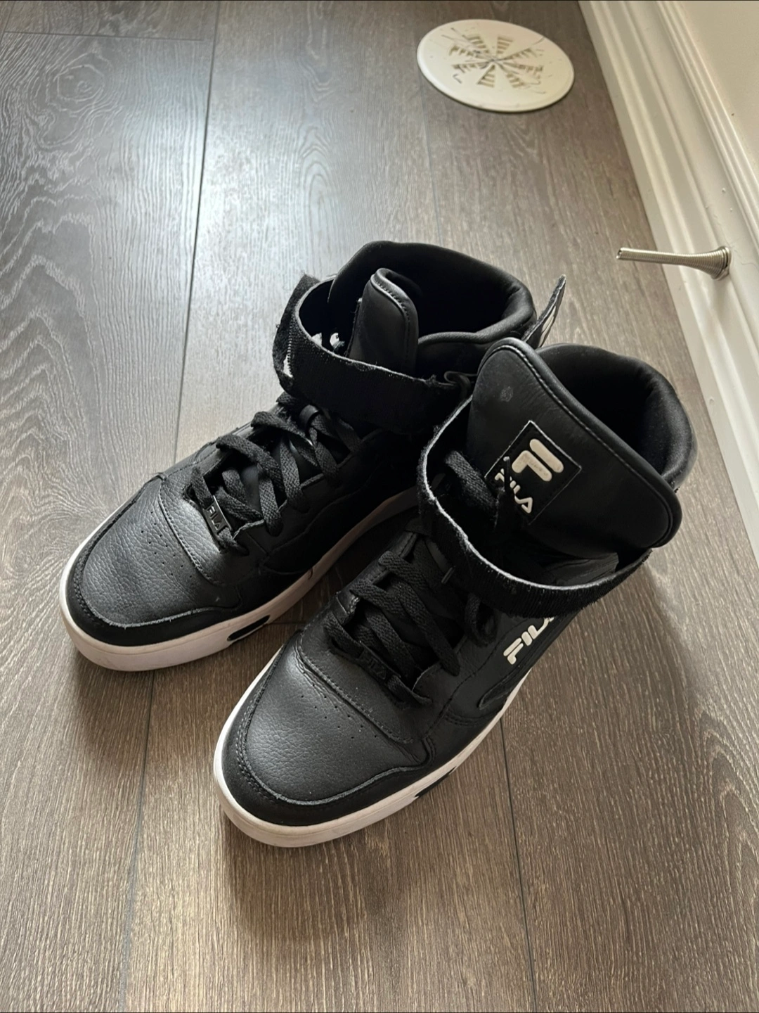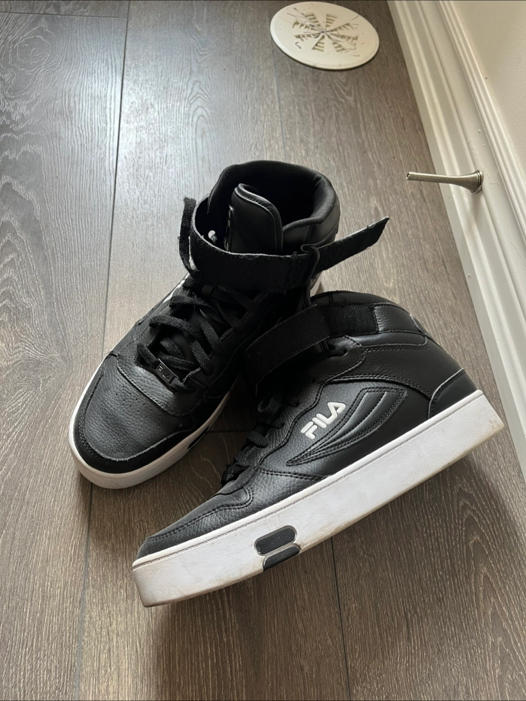Selling a pair of Fila high-top sneakers in black! They're in great shape and ready for a new home. The shoes feature the Fila logo and a velcro strap for extra support.