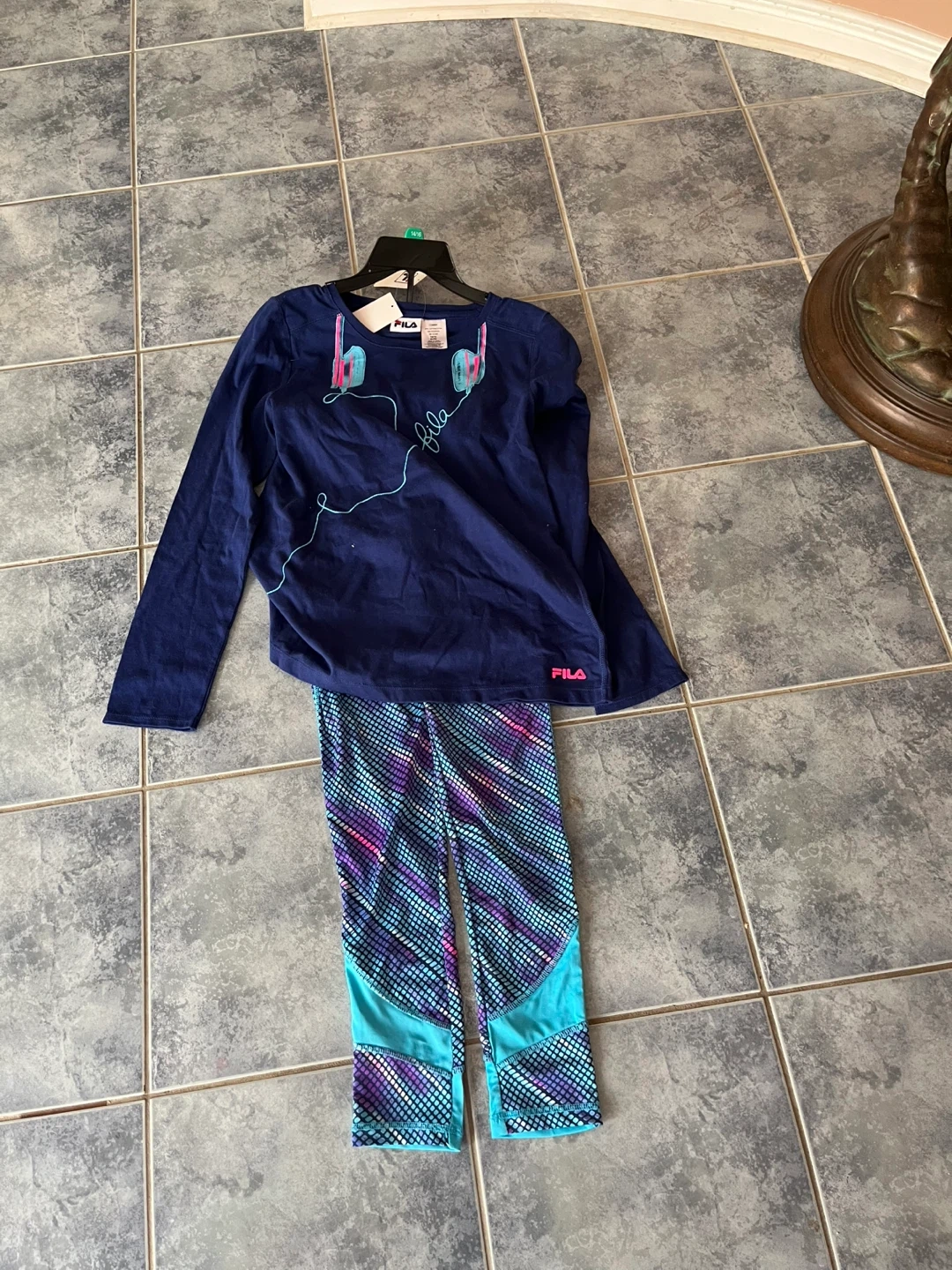 15Cute Fila activewear set for girls, size 16. Includes a navy long-sleeve top with a headphone design and patterned leggings. Perfect for sports or everyday wear!