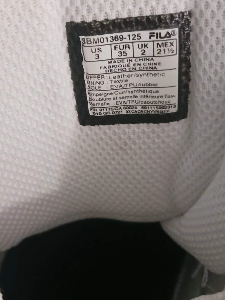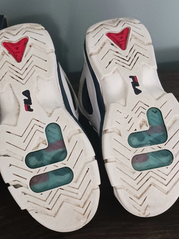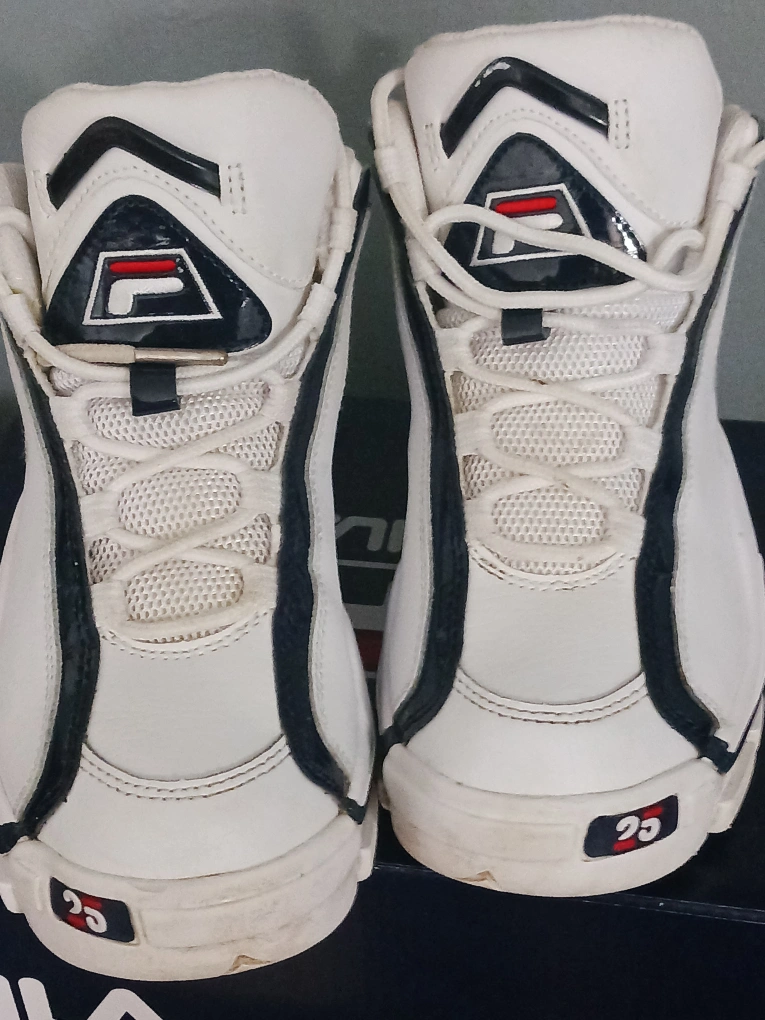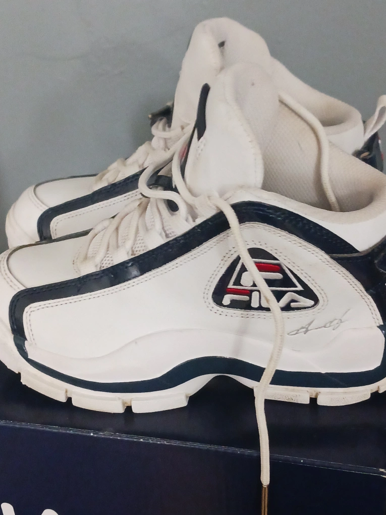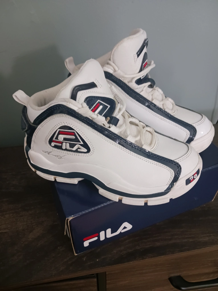 18Pre-owned Fila Grant Hill 2 basketball shoes. White and navy colour scheme. Size US 3. Made in China. Leather and synthetic upper. EVA/TPU/rubber sole.