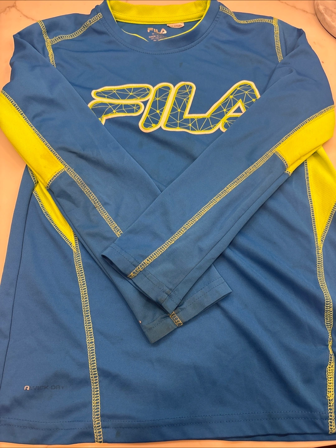 Selling a Fila long-sleeve shirt in blue! It's a quick-dry material, perfect for sports or everyday wear. There are some small stains on the front, but otherwise in good condition!