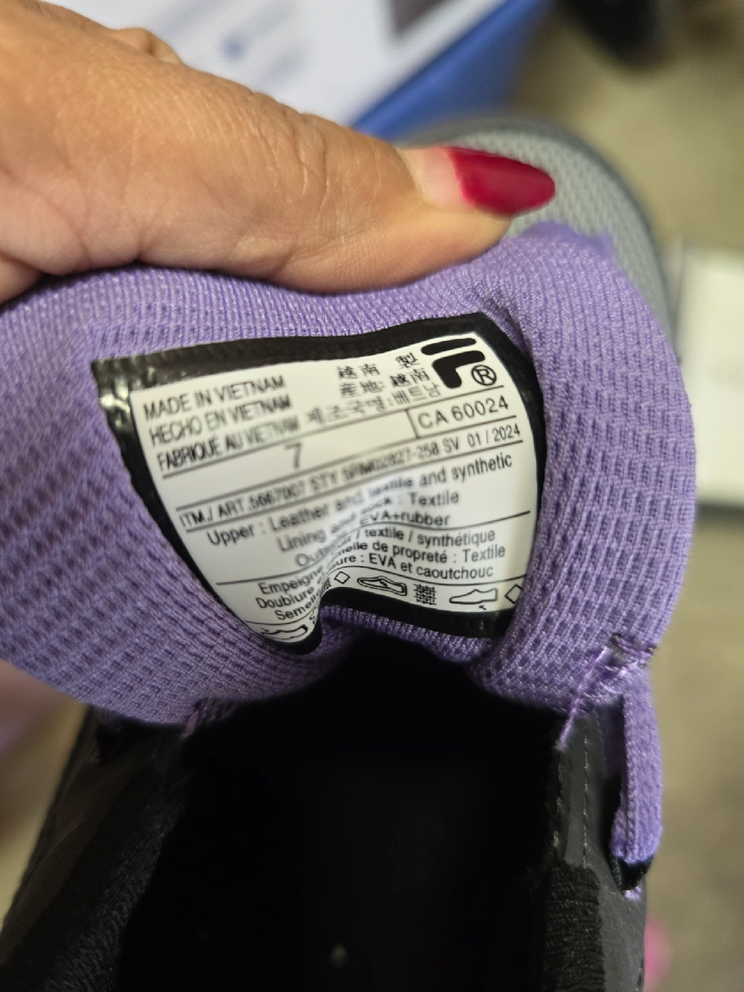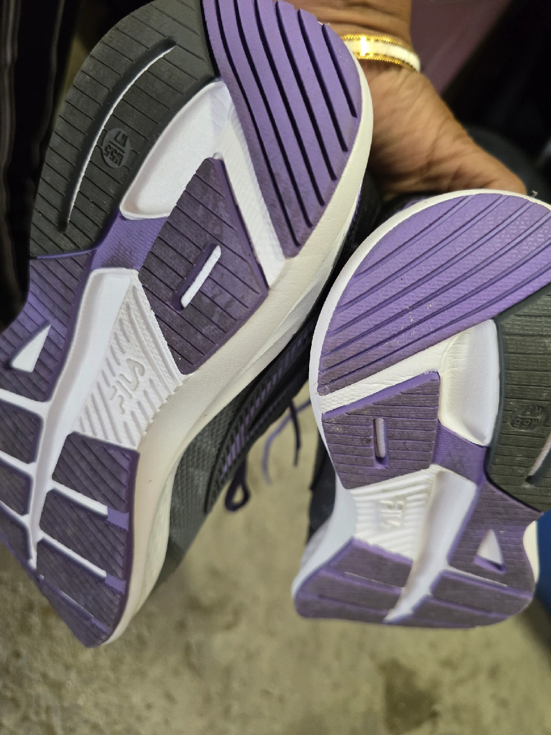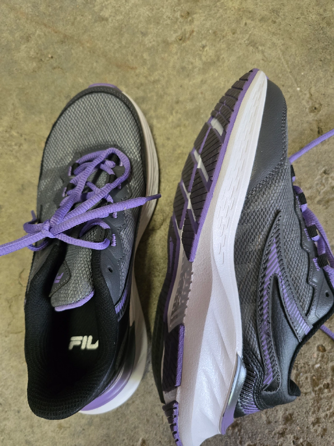 Selling a pair of Fila running shoes in women's size 7. They feature a stylish grey and purple colour scheme. The upper is made of leather and synthetic textile, with EVA and rubber outsoles. They are in good condition and ready for your next run