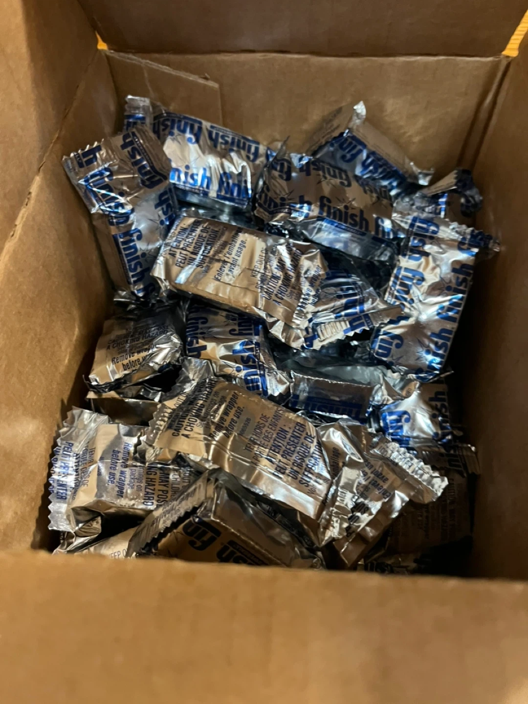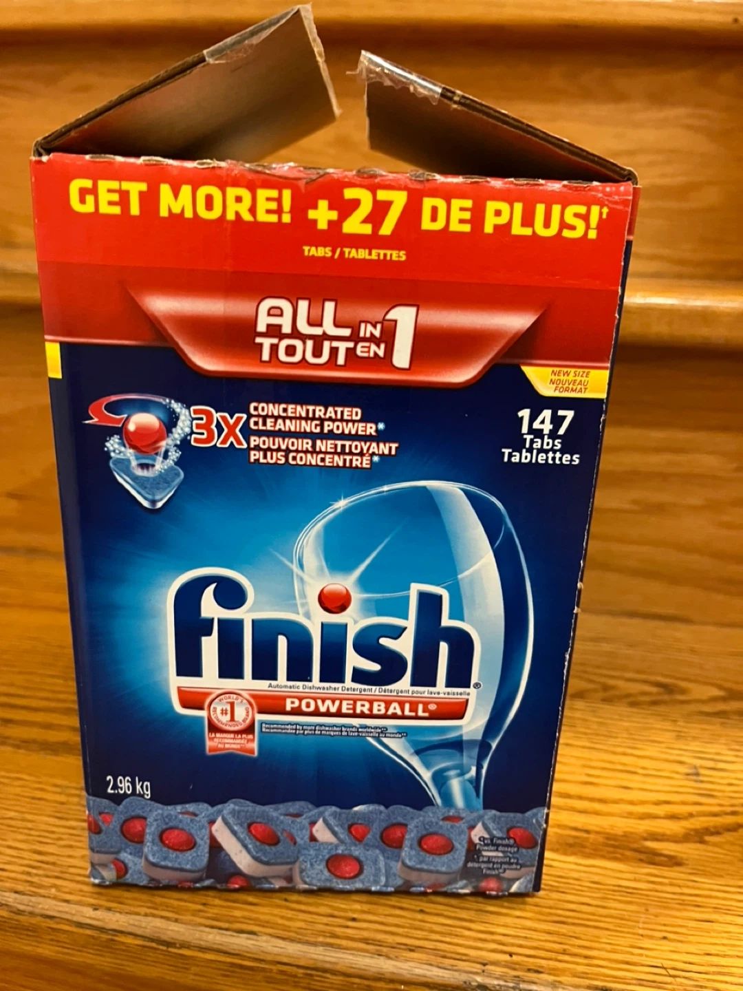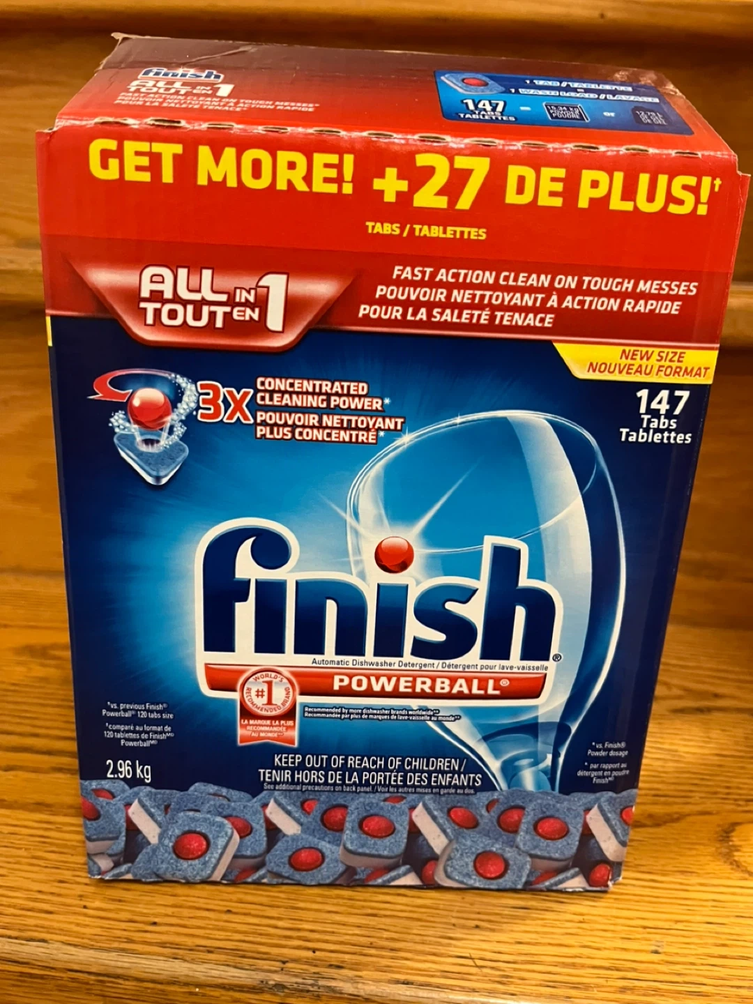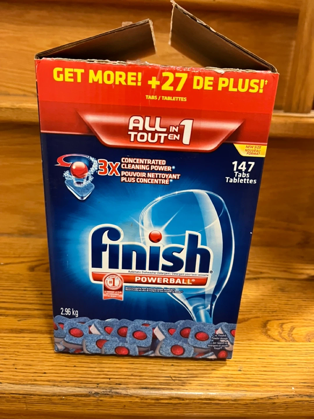 A box of Finish All in 1 Powerball dishwasher detergent tabs. The box contains 147 tabs. Get your dishes sparkling clean! Used 20 tablets