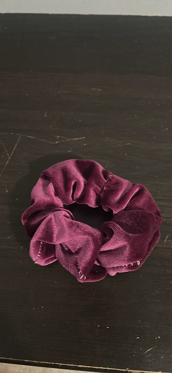 Here's a burgundy velvet scrunchie! It's perfect for adding a touch of soft texture to your hair or wrist. It's in great condition and ready to be your new favourite accessory