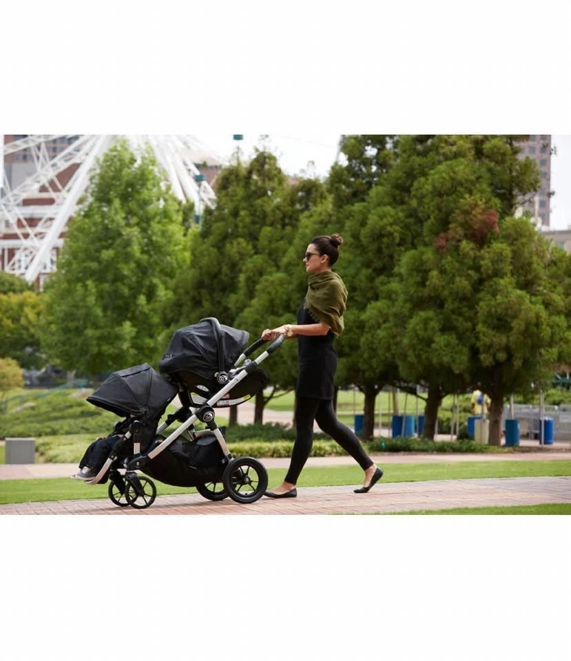This 2017 City Select double stroller comes with a second seat, which is usually sold separately. It is compatible with various car seats. It has been in storage since 2019 and functions perfectly, just needing a good clean. A handlebar storage compartment accessory is also included.