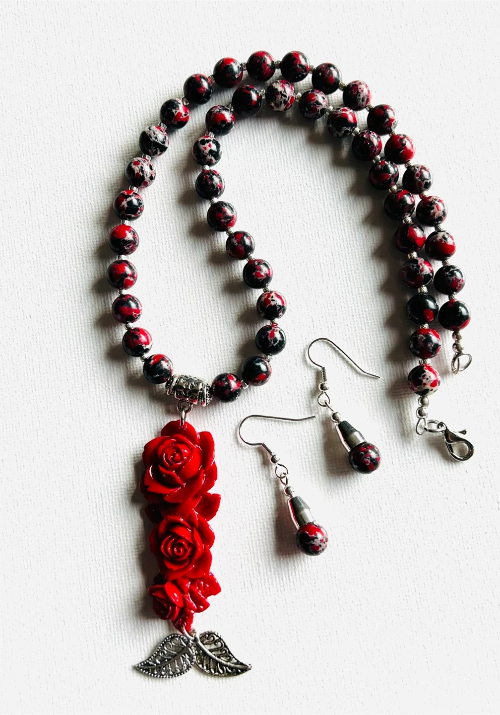 60Beautiful red and black Fire Agate beaded necklace with a red coral pendant and matching earrings. The pendant features three red roses and silver leaves. The necklace has a lobster claw clasp. A lovely set to add to your collection!