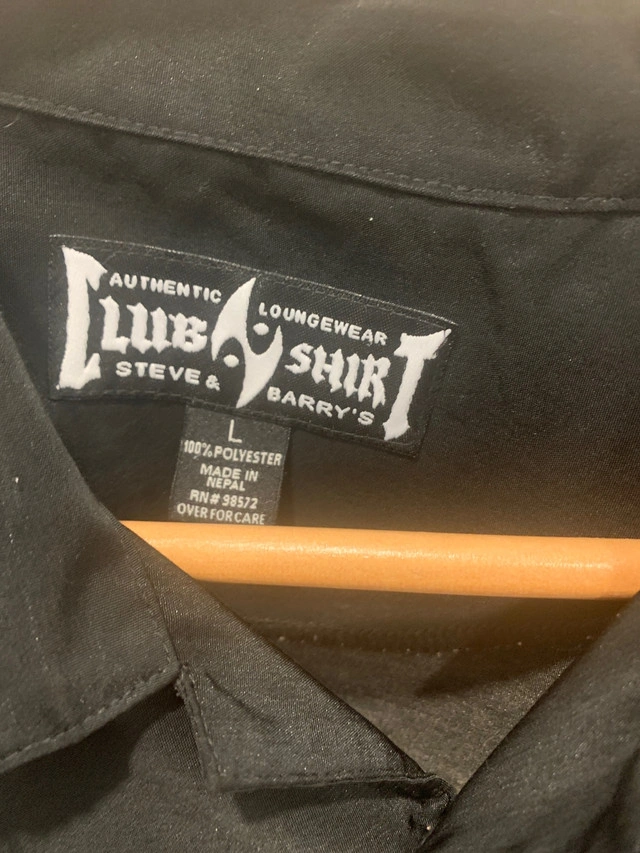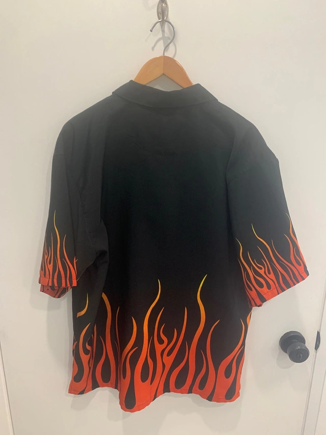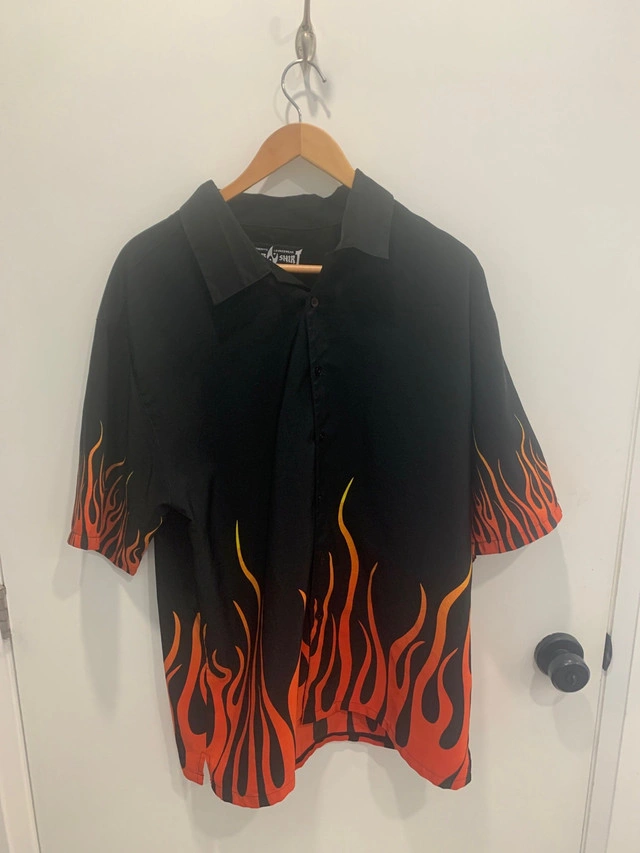 Ignite your style with this pre-owned Club Luv6 Loungewear flame shirt, featuring a bold flame design, short sleeves, and a comfortable fit! This shirt is in good condition, ready to add some heat to your wardrobe. It is a size large, made in Nepal from 100% polyester. * Brand: Club Luv6 Loungewear * Size: Large * Material: 100% Polyester * Made in Nepal If the ad's still up, the shirt's still available!