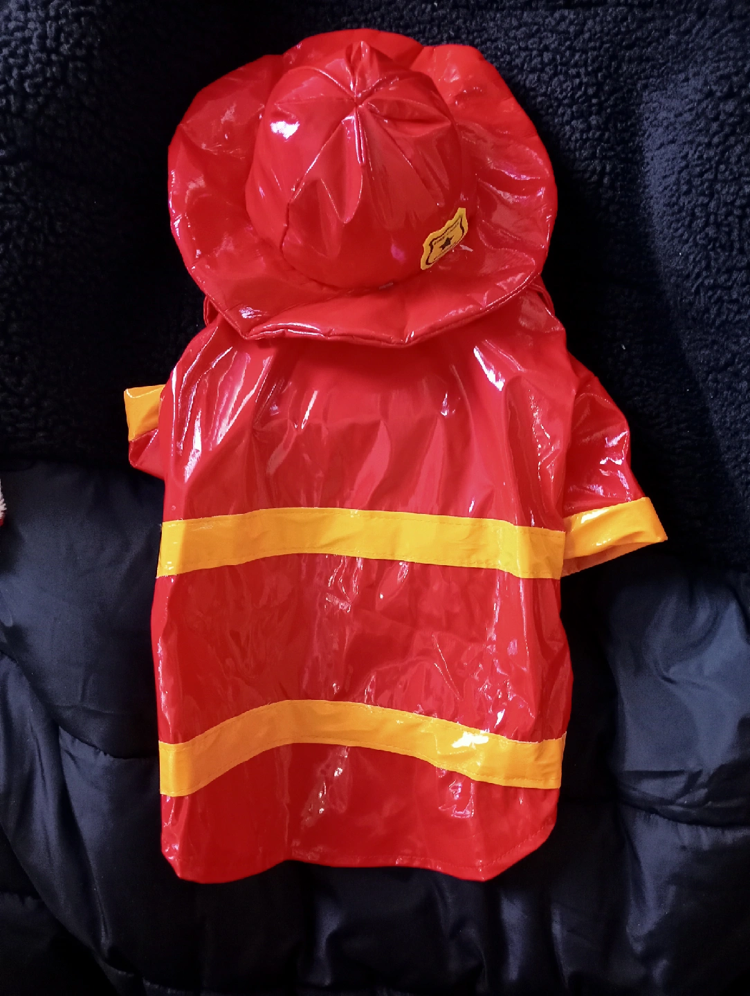 Get your pup ready for some dress-up fun with this adorable firefighter costume! It's a bright red colour with yellow stripes and includes a matching hat to complete the look. size back length -14in neck width - 13.7in chest - 17in