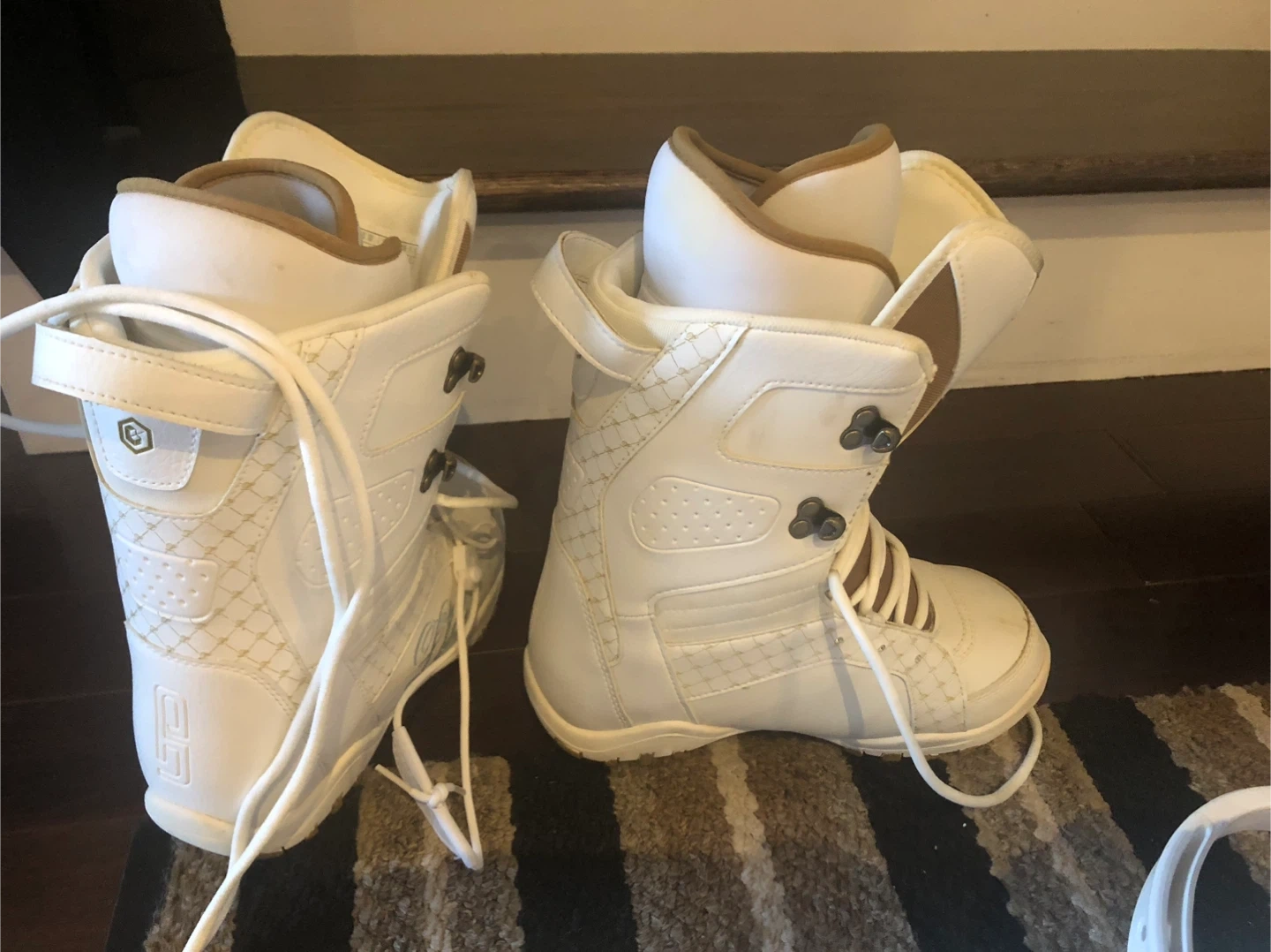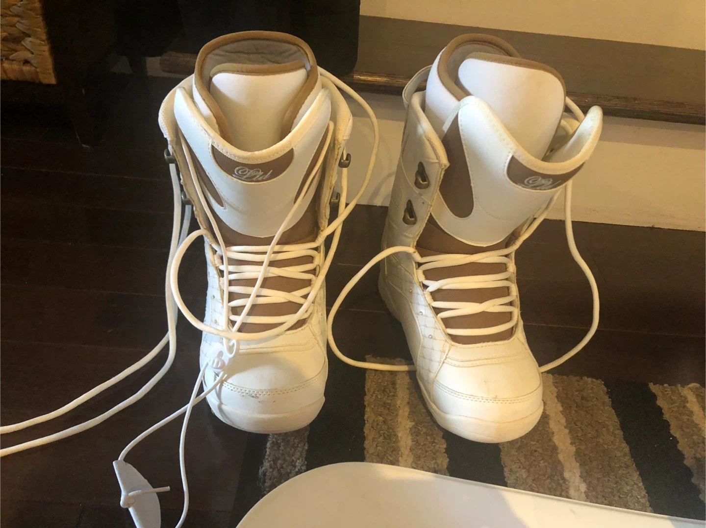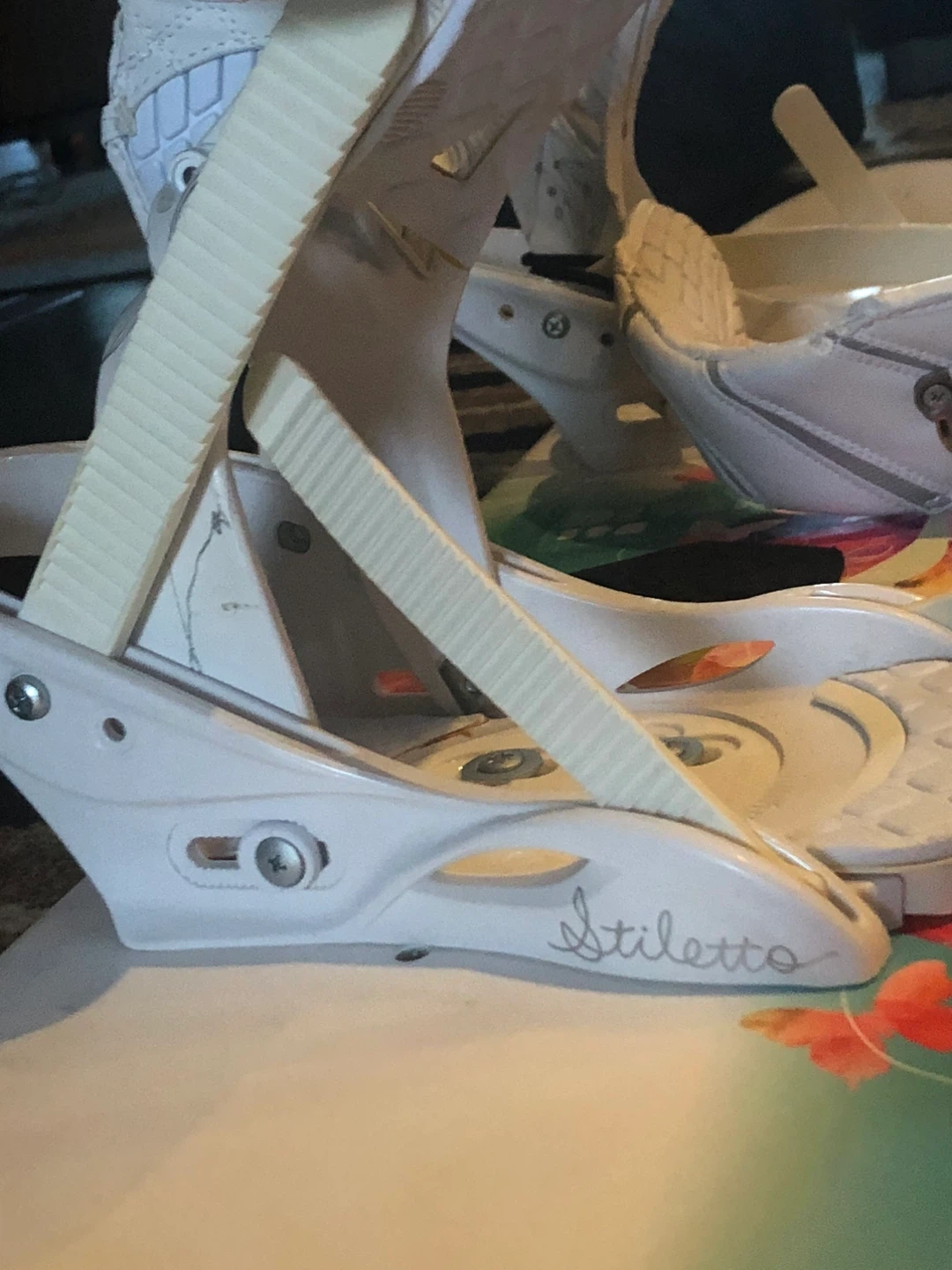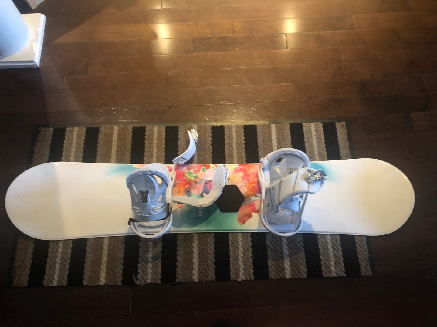 31Selling a Stiletta snowboard that's in great shape and ready for the slopes! It comes with bindings already attached, so you're all set to go. The board features a lovely floral design that adds a touch of style to your ride. Perfect for anyone looking for a reliable and attractive snowboard! in All items boots, snowboard and helmet $200. Or individually: Helmet medium $40 -boots size 8 us $50 -snowboard $150