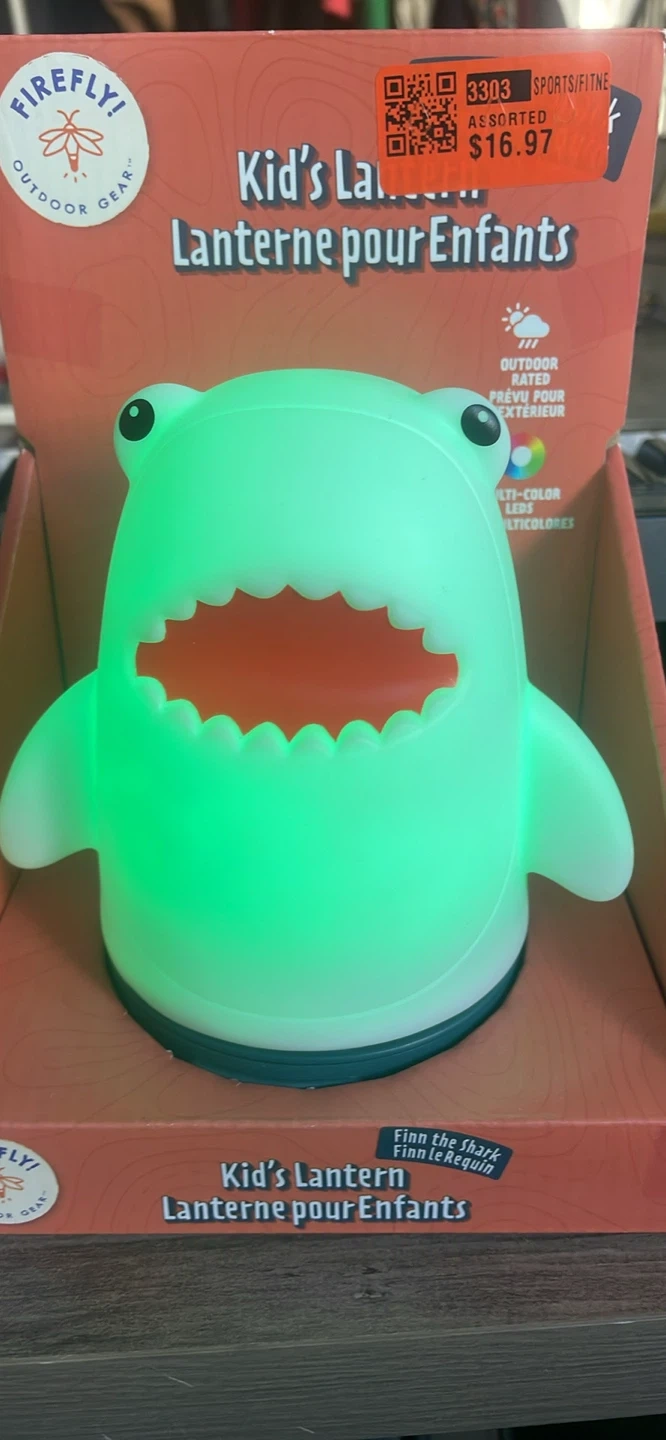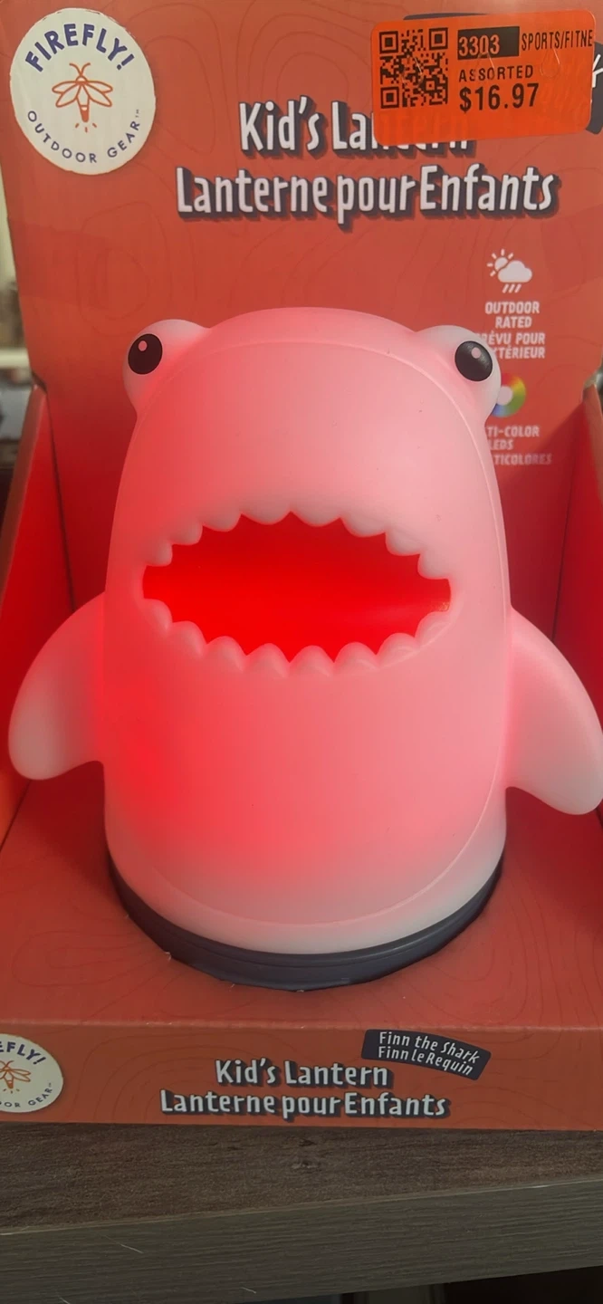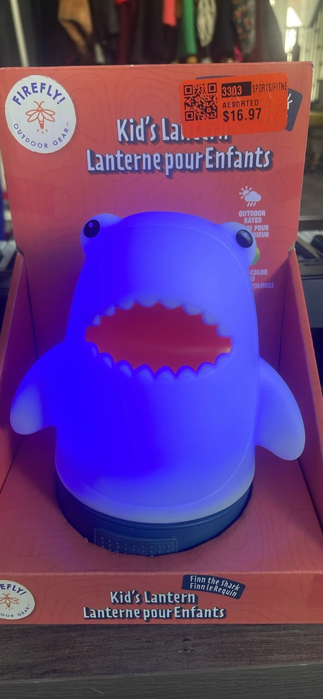 This adorable Firefly! Outdoor Gear Kid's Lantern is shaped like a shark! It features six colourful light modes for any adventure. It's made of a soft material and is great for all ages. It also has an auto shutoff after 2 hours to preserve battery life. The dimensions are 5.2" x 4.5" x 5.7"
