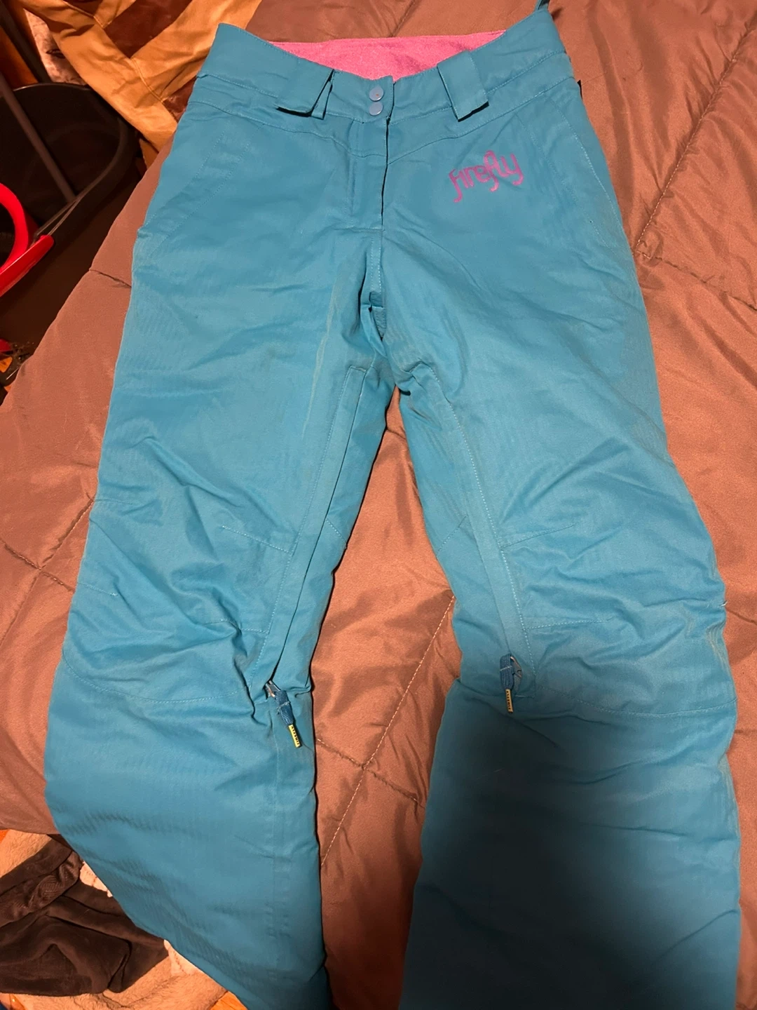 Selling a pair of Firefly snow pants in size medium! They are in great condition and ready for the slopes. The colours are a vibrant turquoise with a purple lining. Perfect for staying warm and dry this winter!