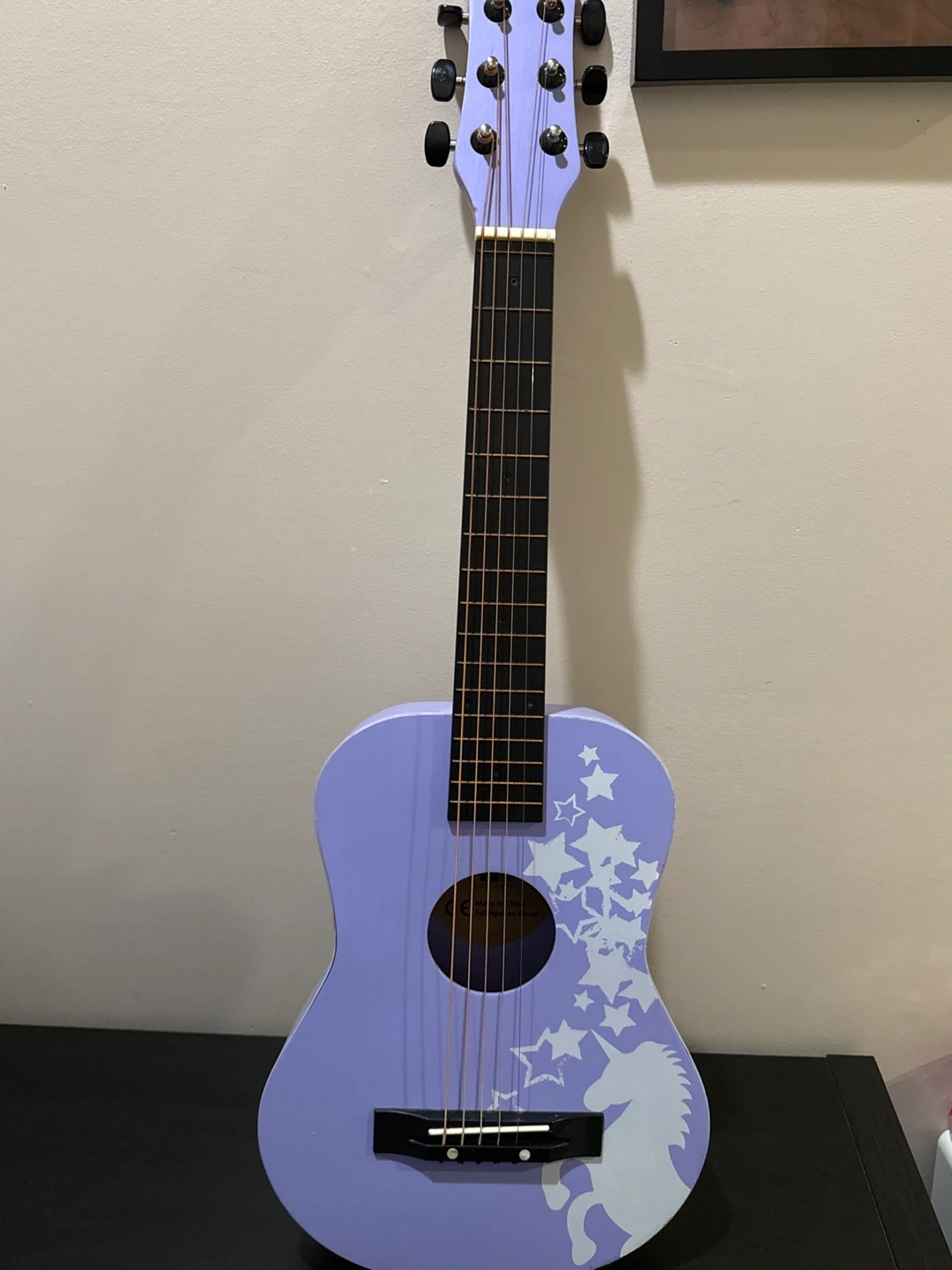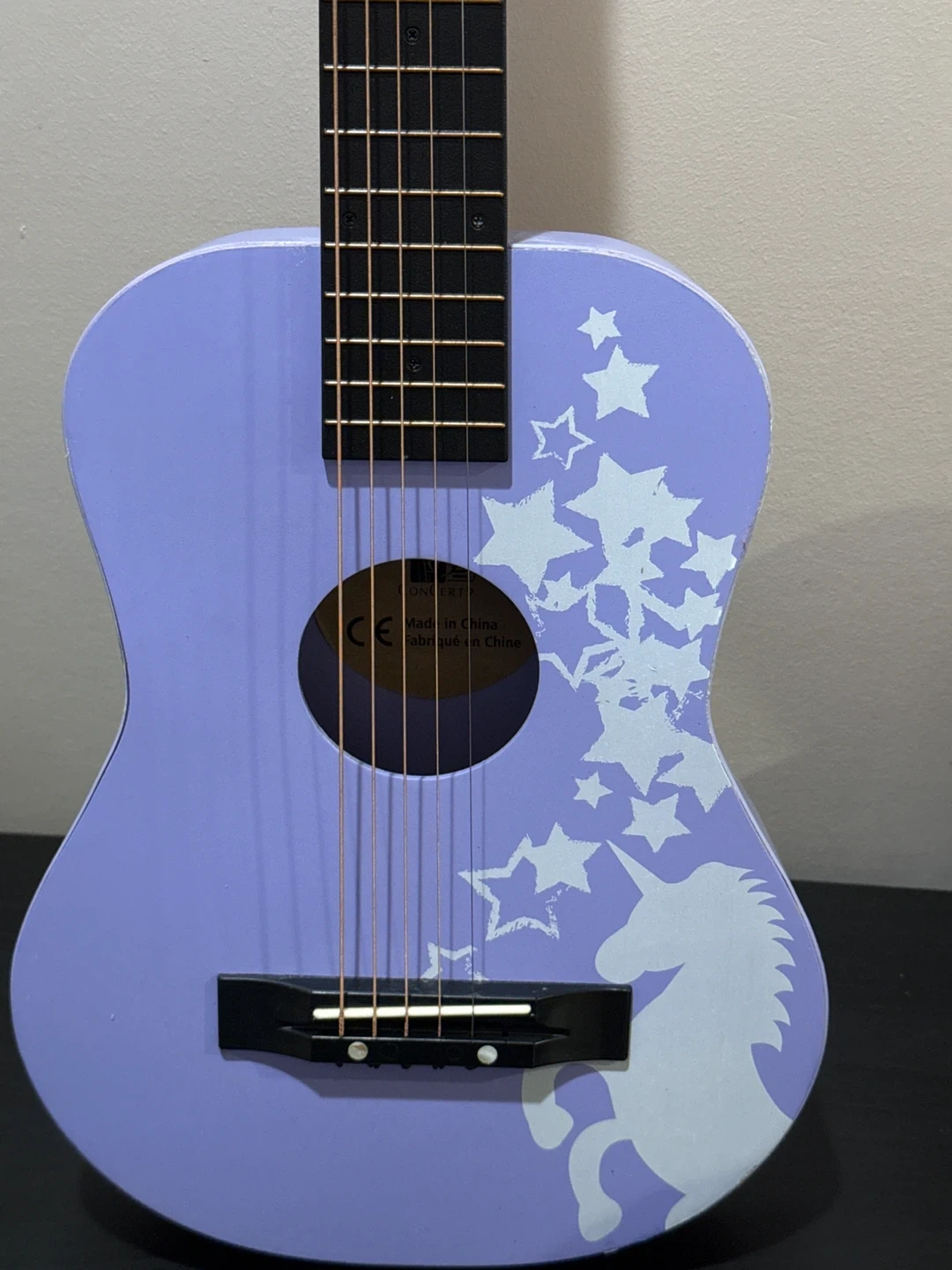 Selling a cute First Act guitar! It's in great shape and perfect for a beginner. The guitar is a lovely light purple colour and features a unicorn and stars design. It's a fun way to start learning music!
