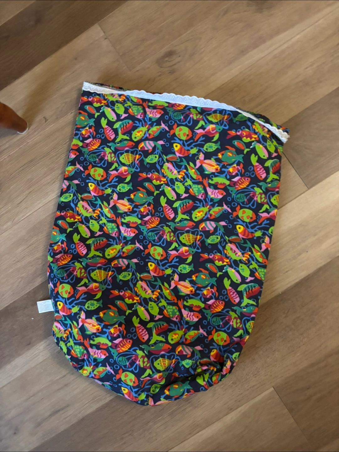 This is a cute, pet crinkle bag with a fun fish print for hours of enjoyment for your feline friend. The bag features a colourful pattern with various fish designs on a dark blue background, finished with a white lace trim at the top. It's in great condition and ready for a new home!