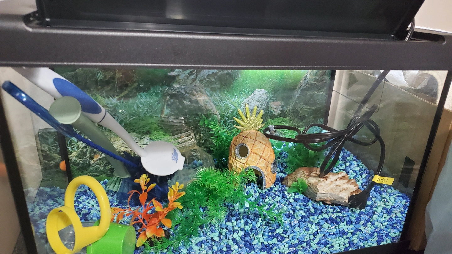 10 gallon fish tank, has heater, accessories, cleaning supplies, some fish food, has tank light
