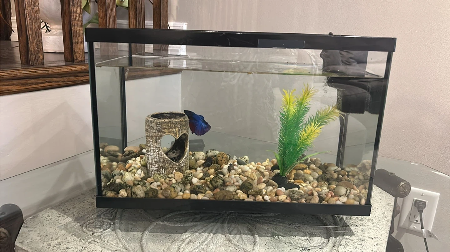 Selling a fish tank that comes with gravel, a decorative log with a heart, and a plastic plant. Perfect for a small fish or betta!