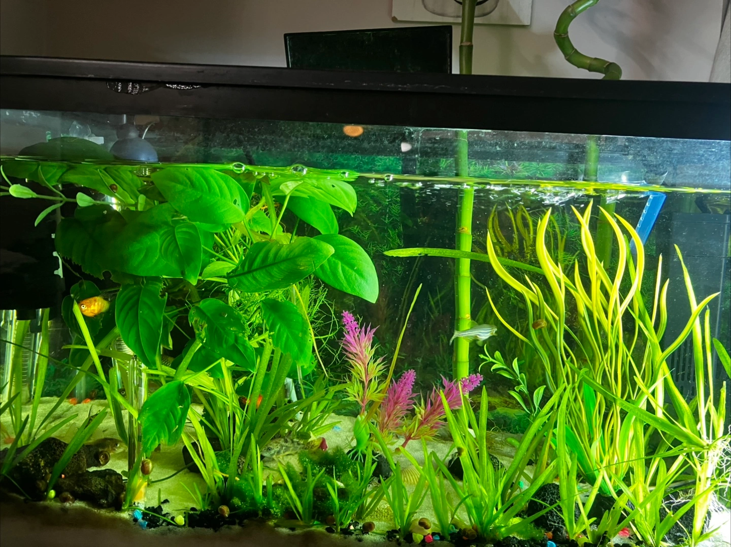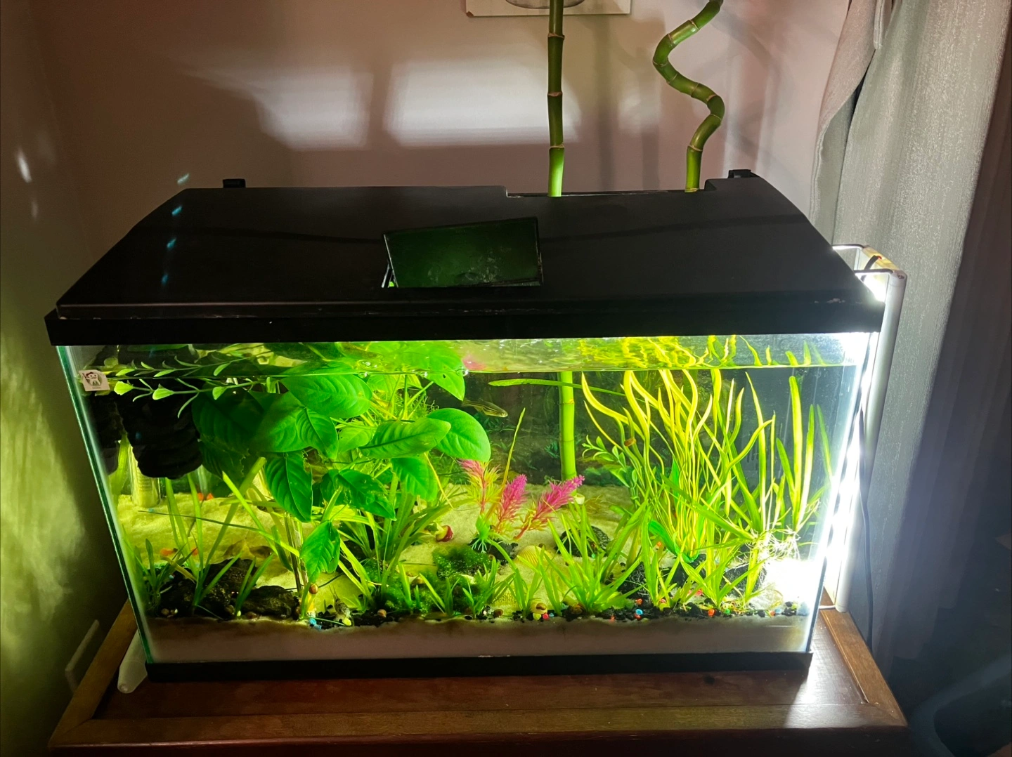 Selling a fish tank, complete with gravel, plants, fish, and accessories! It's all set up and ready to go for a new home. A great starter kit for someone looking to get into fishkeeping