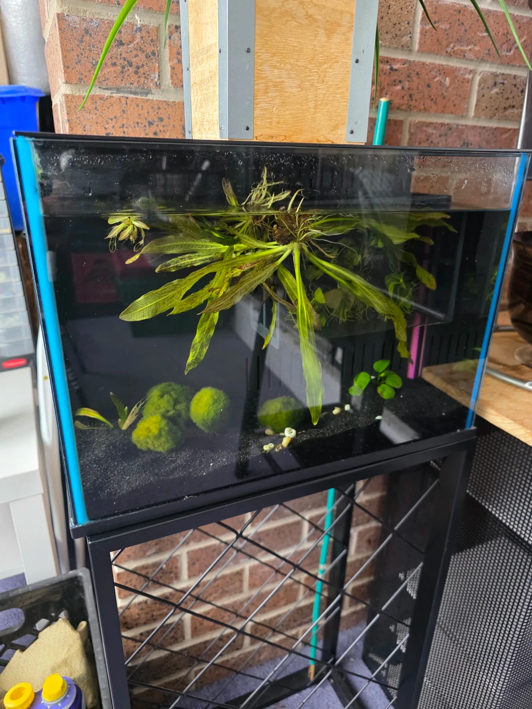 26Selling a fish tank with a stand. It's in good condition and ready for a new home! Perfect for setting up your aquarium 6 gallon Black sand Moss balls x4 Annubais plant included small rooted pieces Sword plant Snail No light Canopy Stand extra $20