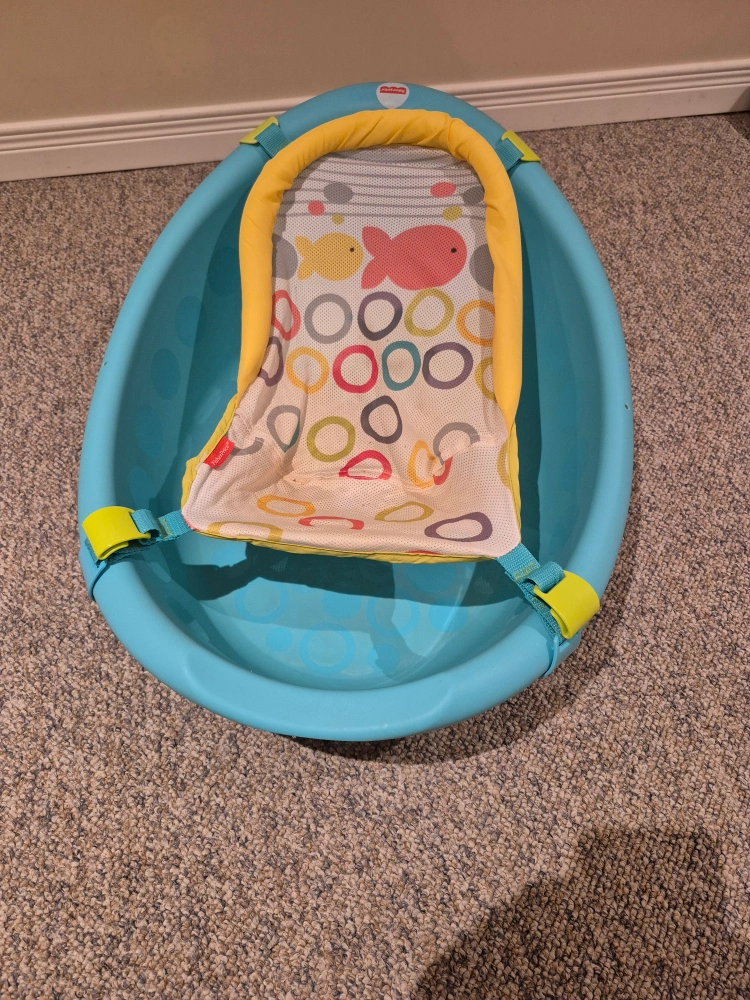 Selling a gently used Fisher-Price baby bathtub. It's in great shape and ready for a new little one! The tub is a light blue colour with a supportive mesh sling featuring a cute fish pattern. Perfect for making bath time safe and fun