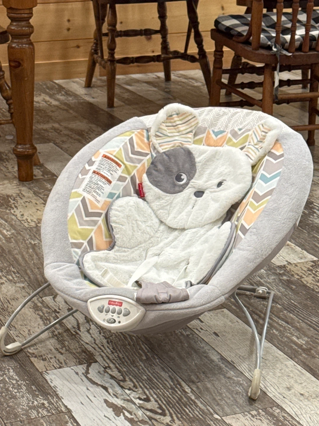 Selling a gently used Fisher-Price baby bouncer! It's in great condition and ready for a new little one. The bouncer is designed with a cute dog theme and has a soothing vibration feature to help calm and relax your baby. Perfect for infants!