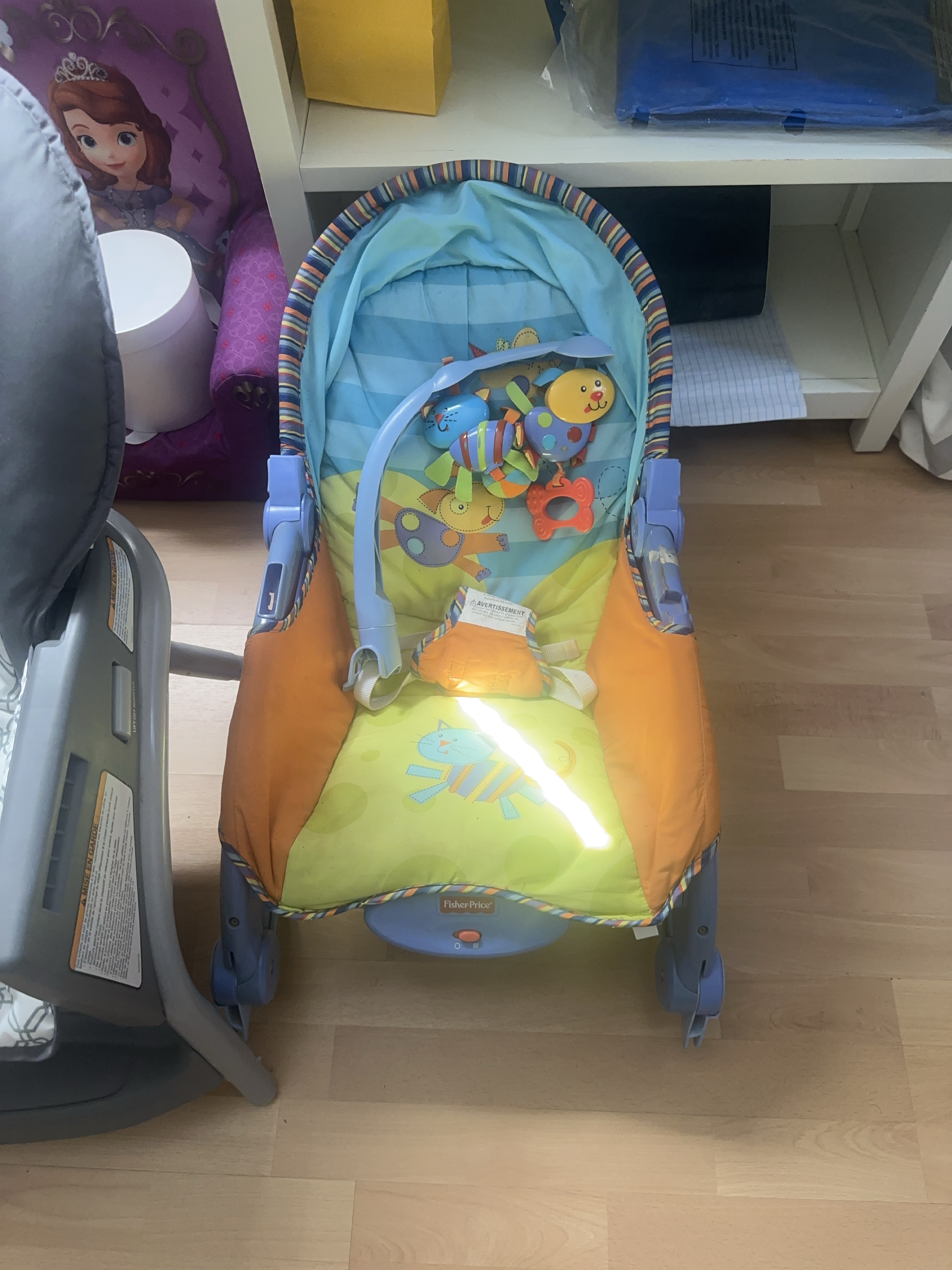 76Selling a Fisher-Price baby bouncer in good condition. It features a colourful design with hanging toys to keep your little one entertained. Perfect for infants and small babies!