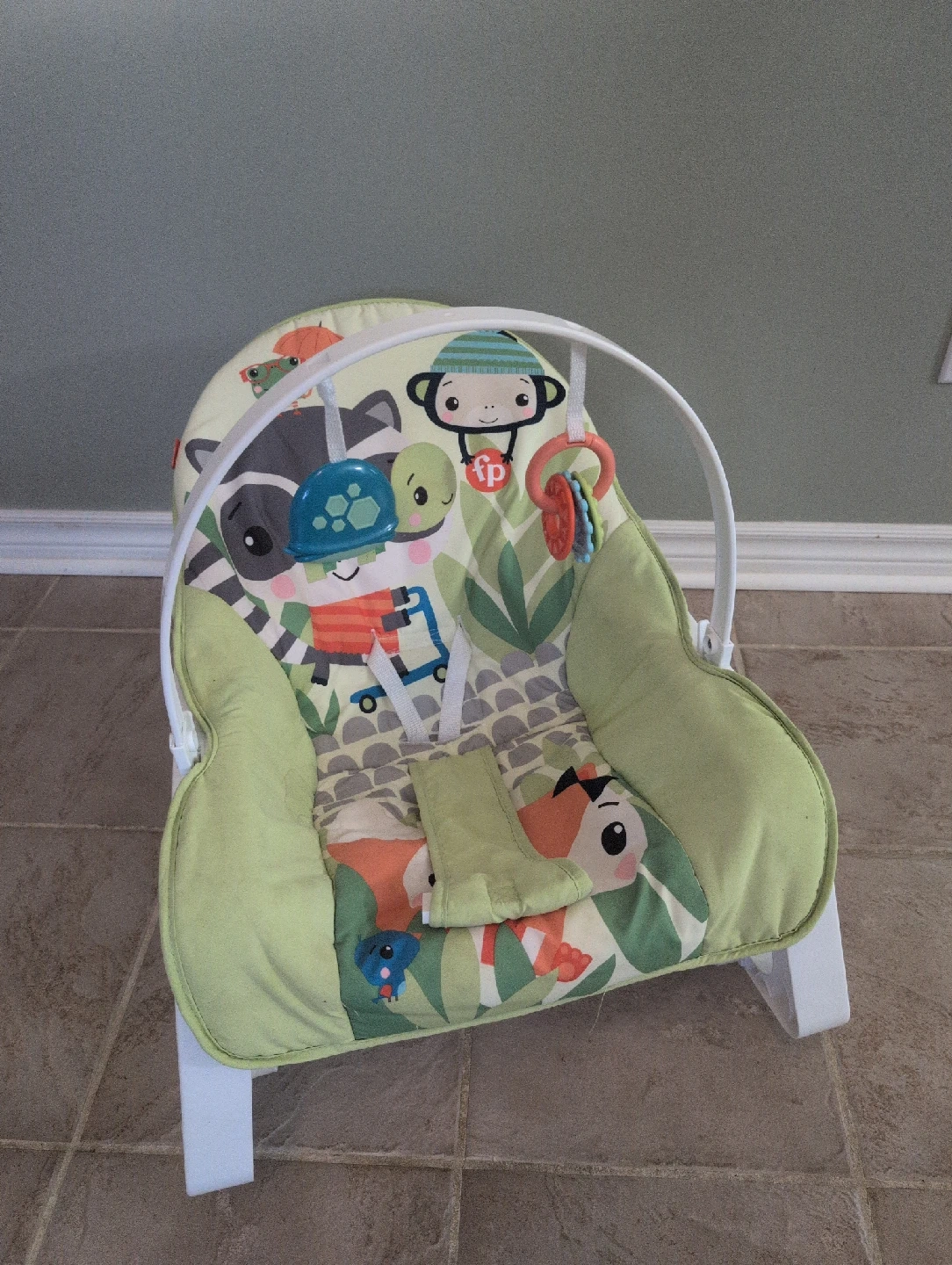 10Selling a gently used Fisher-Price baby bouncer seat! It has a gentle vibration mode that soothes your little one. It's in good condition and features a fun, colourful animal print. Perfect for keeping your little one entertained and comfortable.