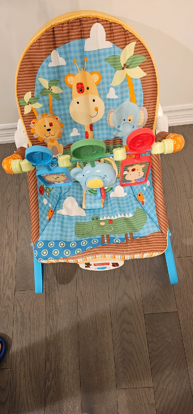 10Selling a gently used Fisher-Price baby bouncer seat. It has a cute animal theme with a giraffe, lion, elephant, and crocodile. Perfect for keeping your little one entertained!