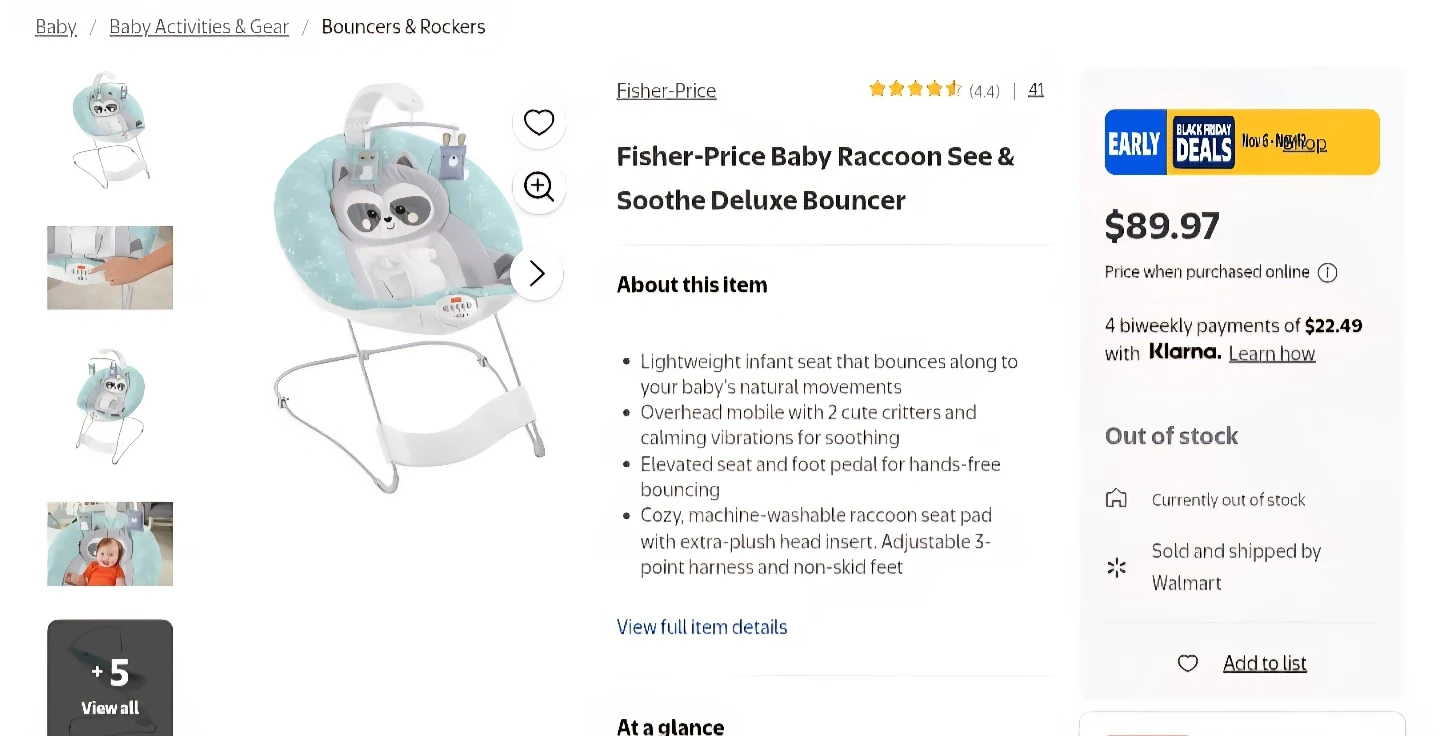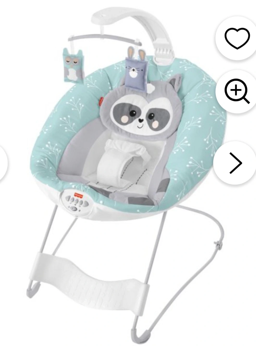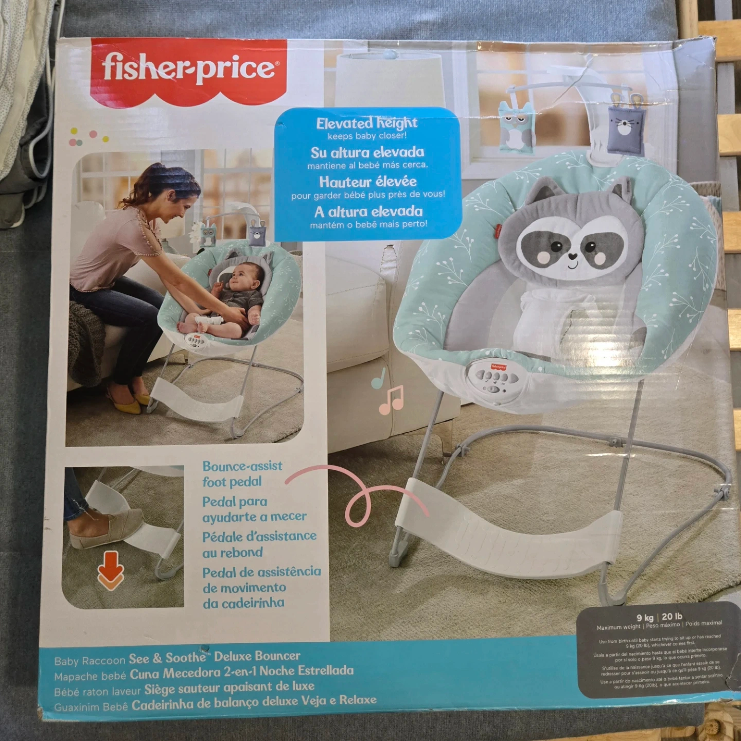 65This Fisher-Price baby bouncer is in brand new condition! It's a lightweight infant seat that bounces along to your baby's natural movements. The overhead mobile has two cute critters and calming vibrations for soothing. It also has an elevated seat and foot pedal for hands-free bouncing. The cozy, machine-washable raccoon seat pad has an extra-plush head insert and adjustable 3-point harness and non-skid feet. Maximum weight is 9 kg / 20 lb