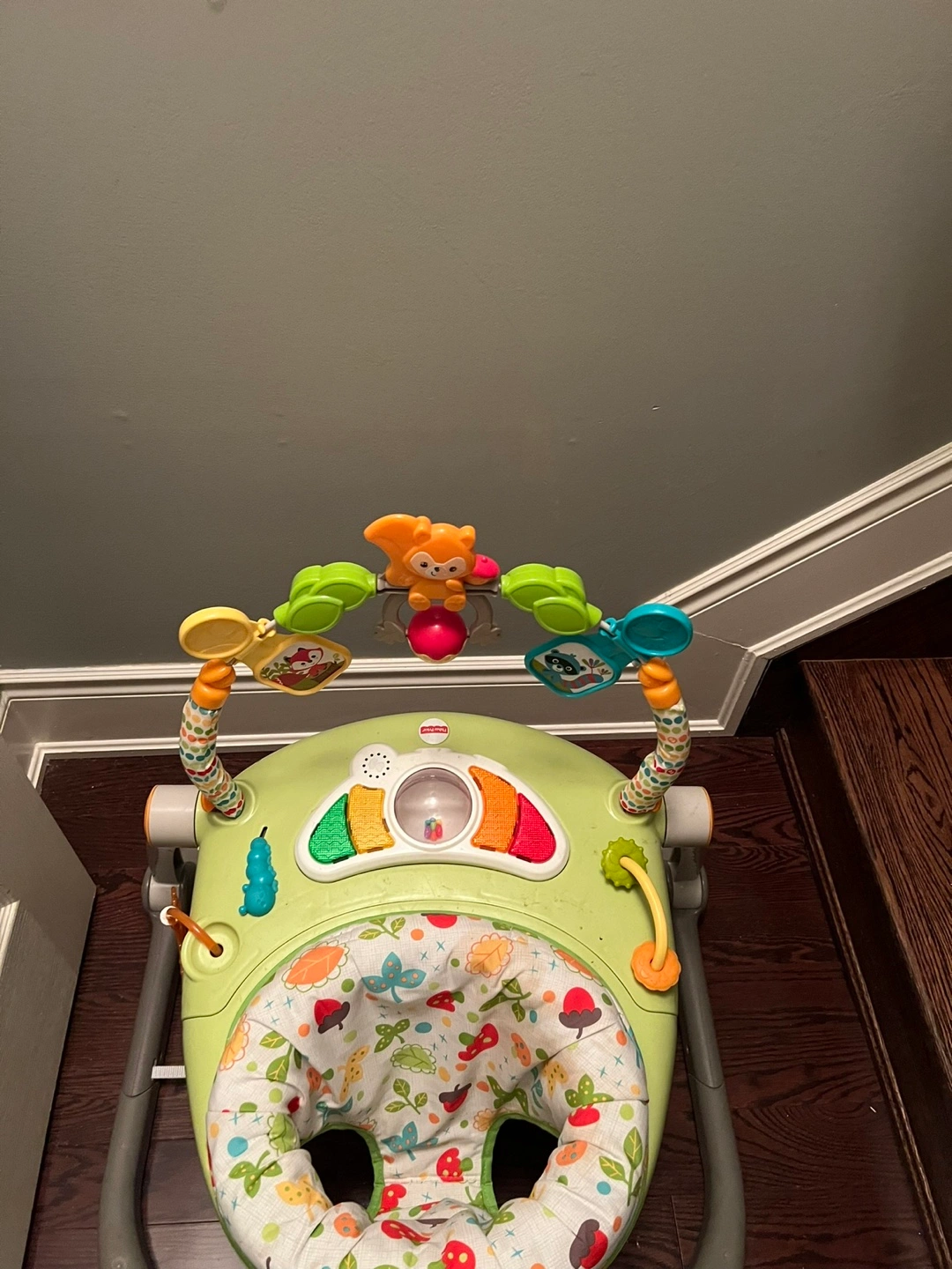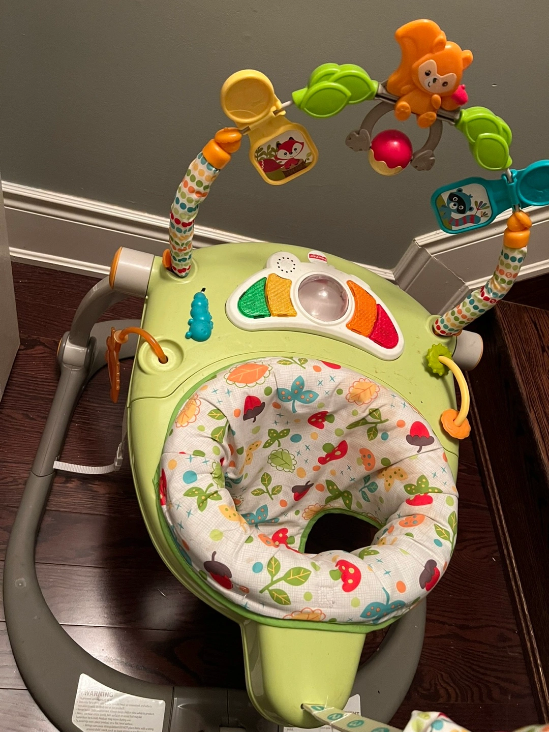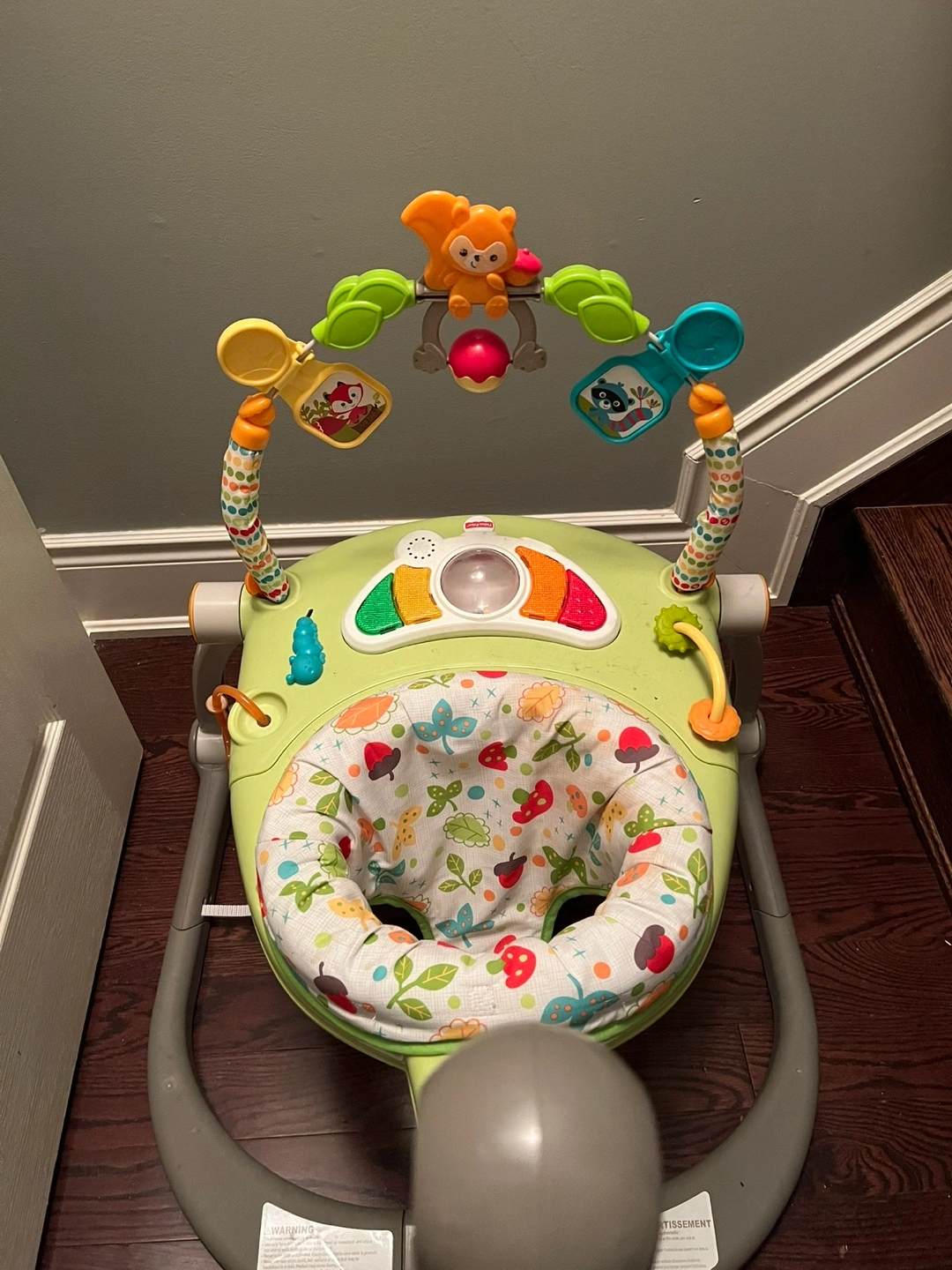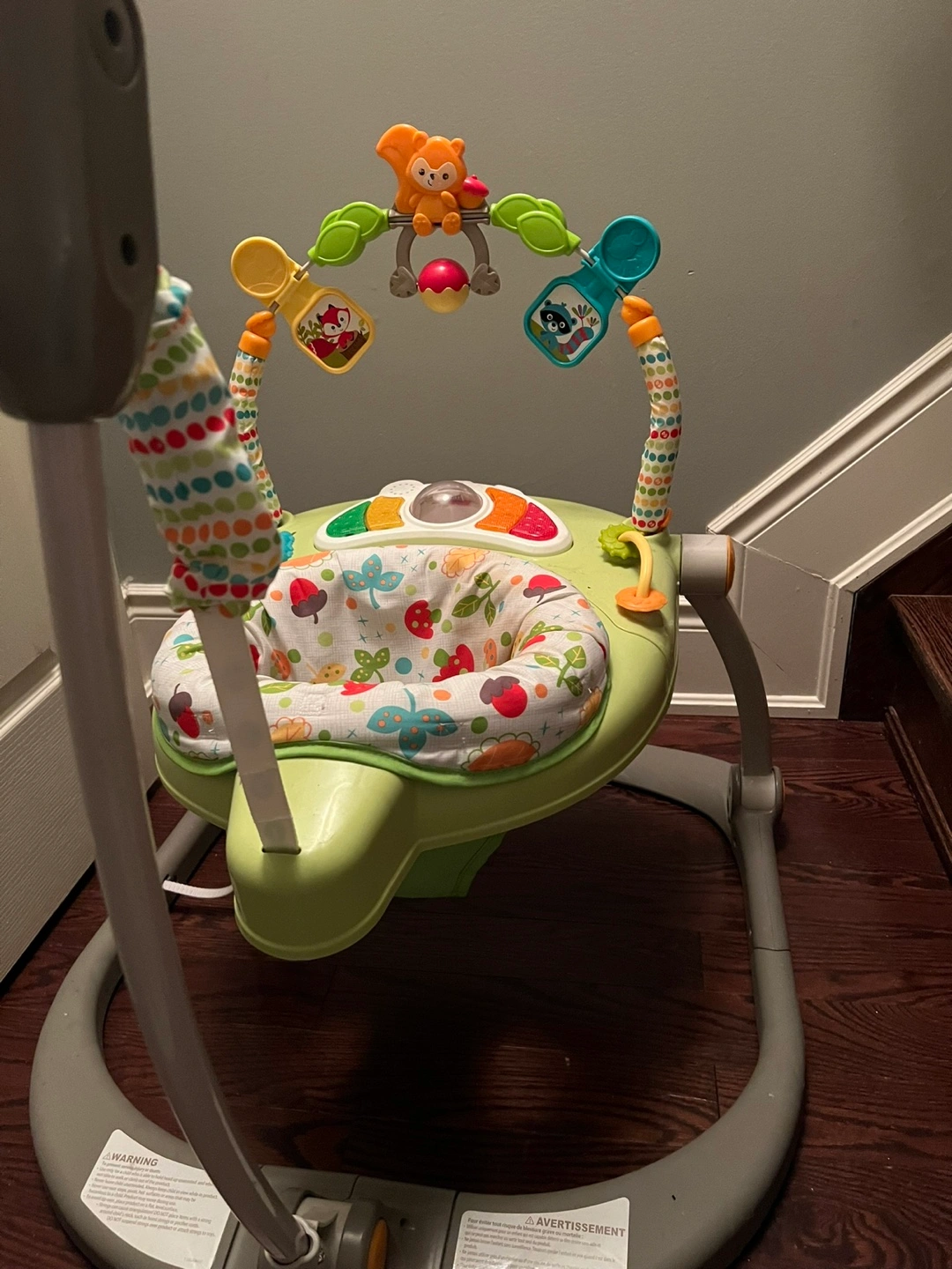 A baby swing with a colourful, patterned seat. Includes a hanging toy bar with attached toys. Imagine your baby swinging safely and comfortably.