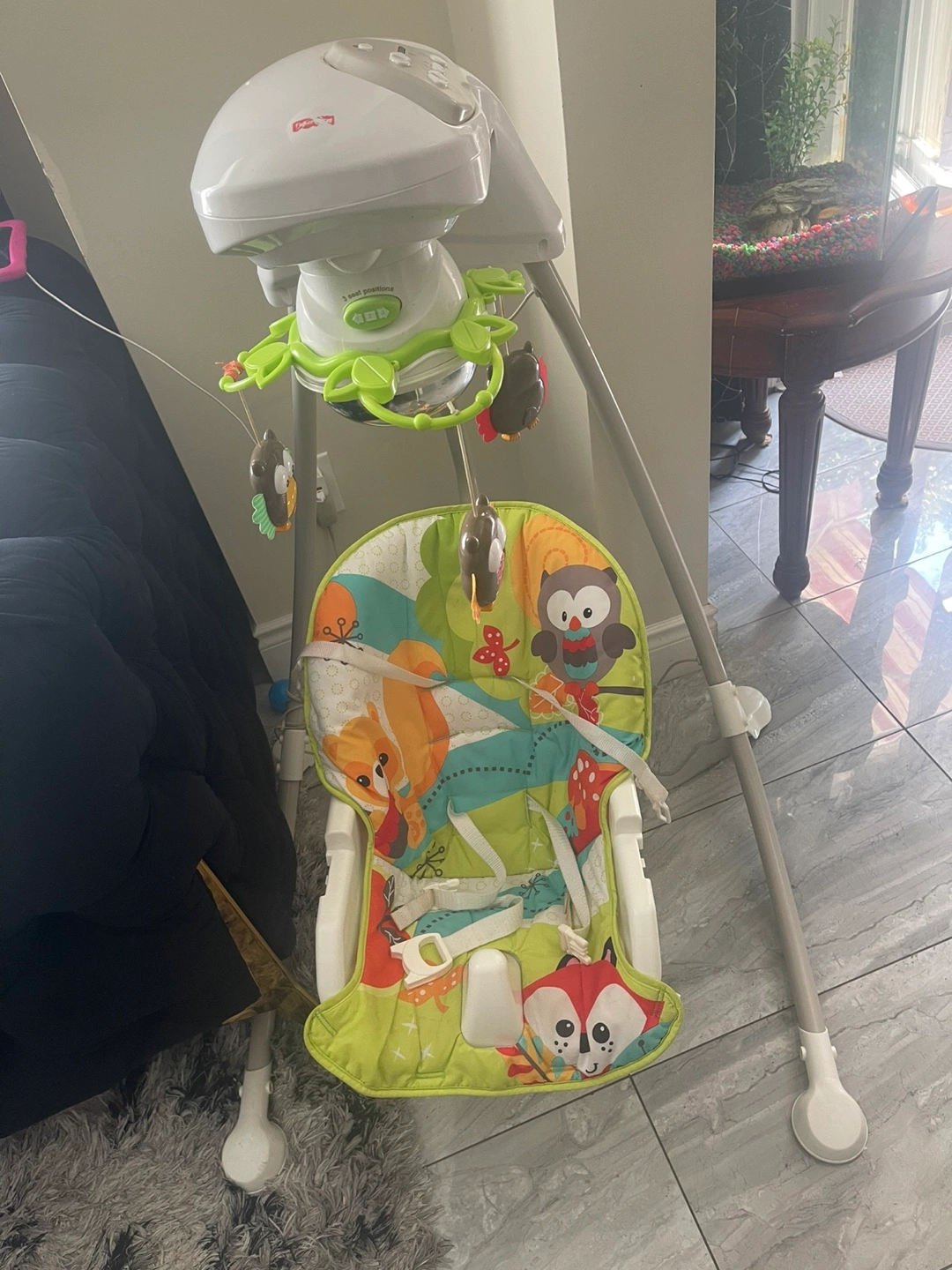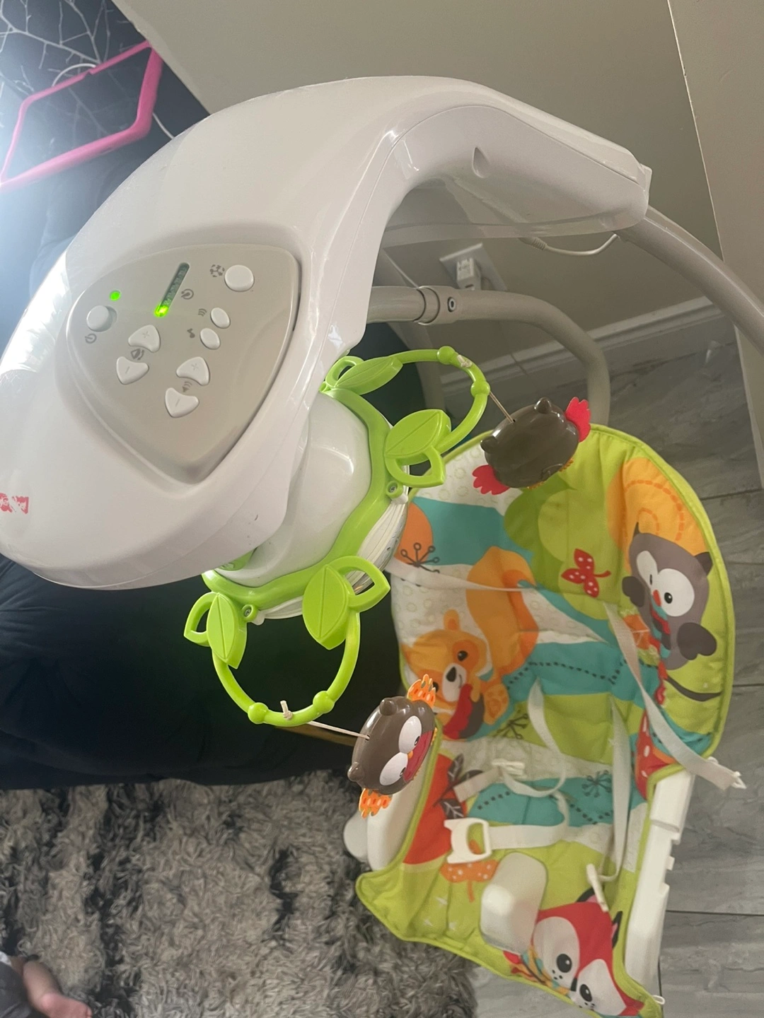Selling a Fisher-Price baby swing in great condition! It features a cute woodland creature design on the seat and includes hanging toys to keep your little one entertained. Perfect for soothing and entertaining your baby!