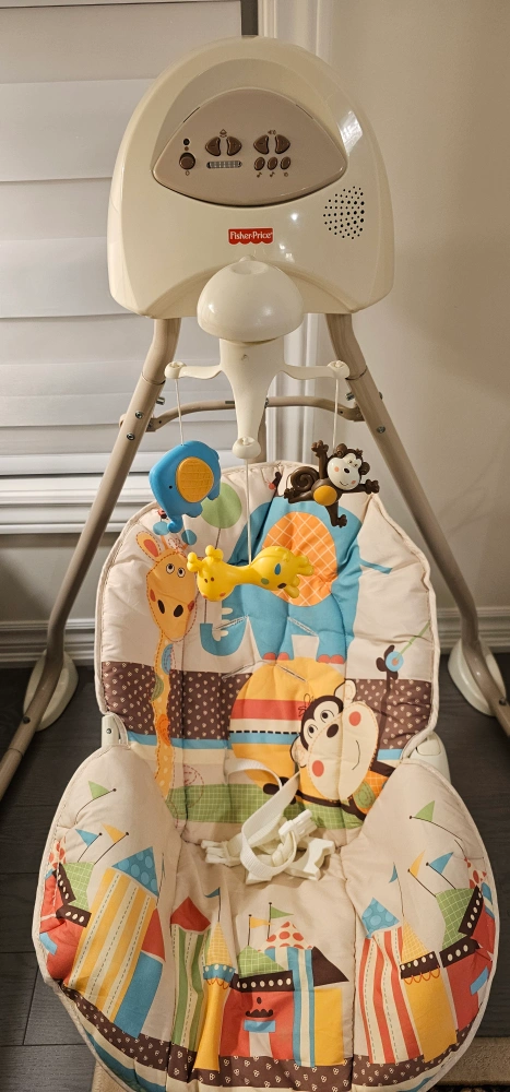 Selling a Fisher-Price baby swing! It comes with a mobile featuring cute animal toys to keep your little one entertained. The swing has different speed settings and plays music, too. Perfect for soothing your baby!